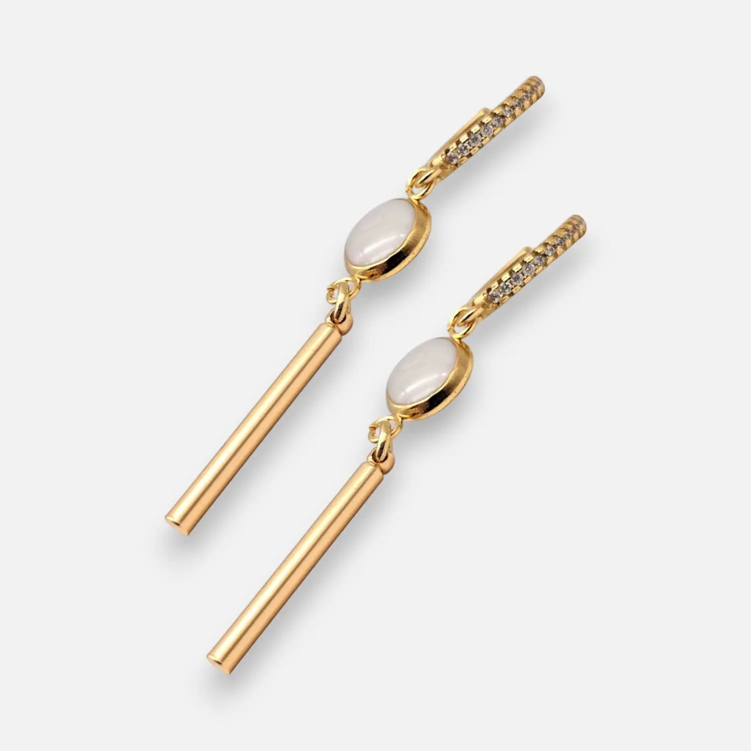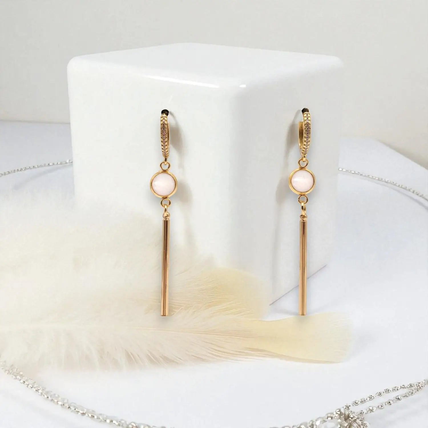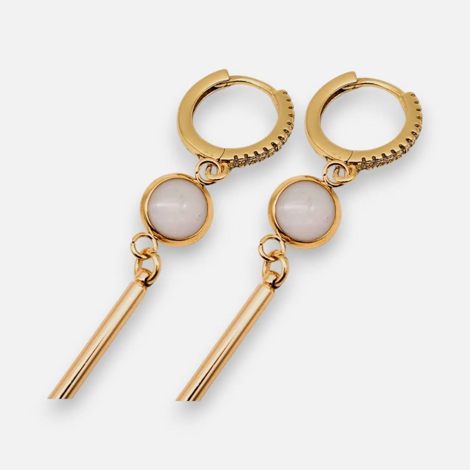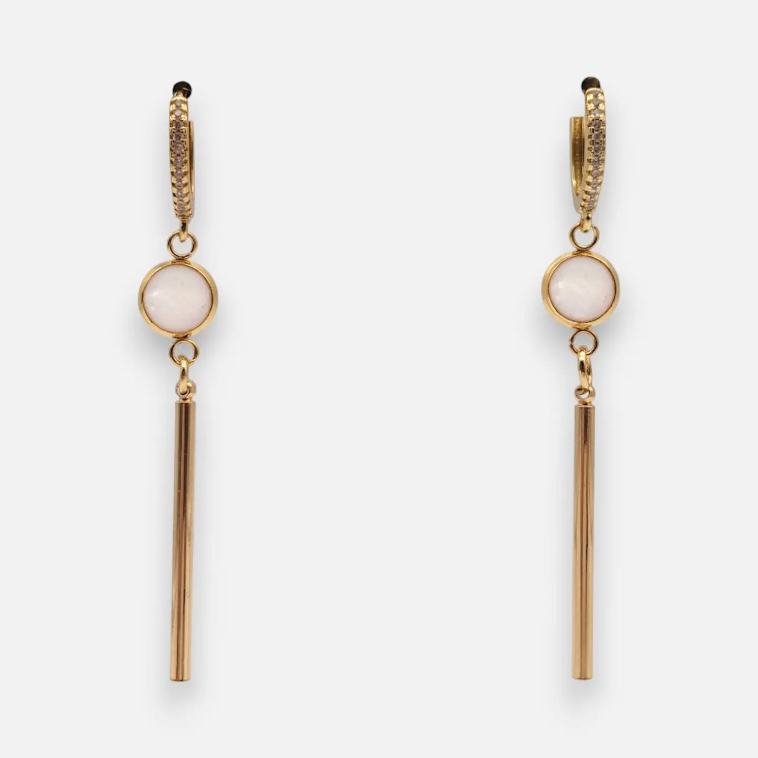 Diese Creolen mit weißen Tönen haben eine Epoxidschale mit einem Durchmesser von 6 mm und eine Länge von 5.5 cm. Messingstangenanhänger, 18k vergoldet. Hergestellt aus 304 Edelstahl, vergoldet.