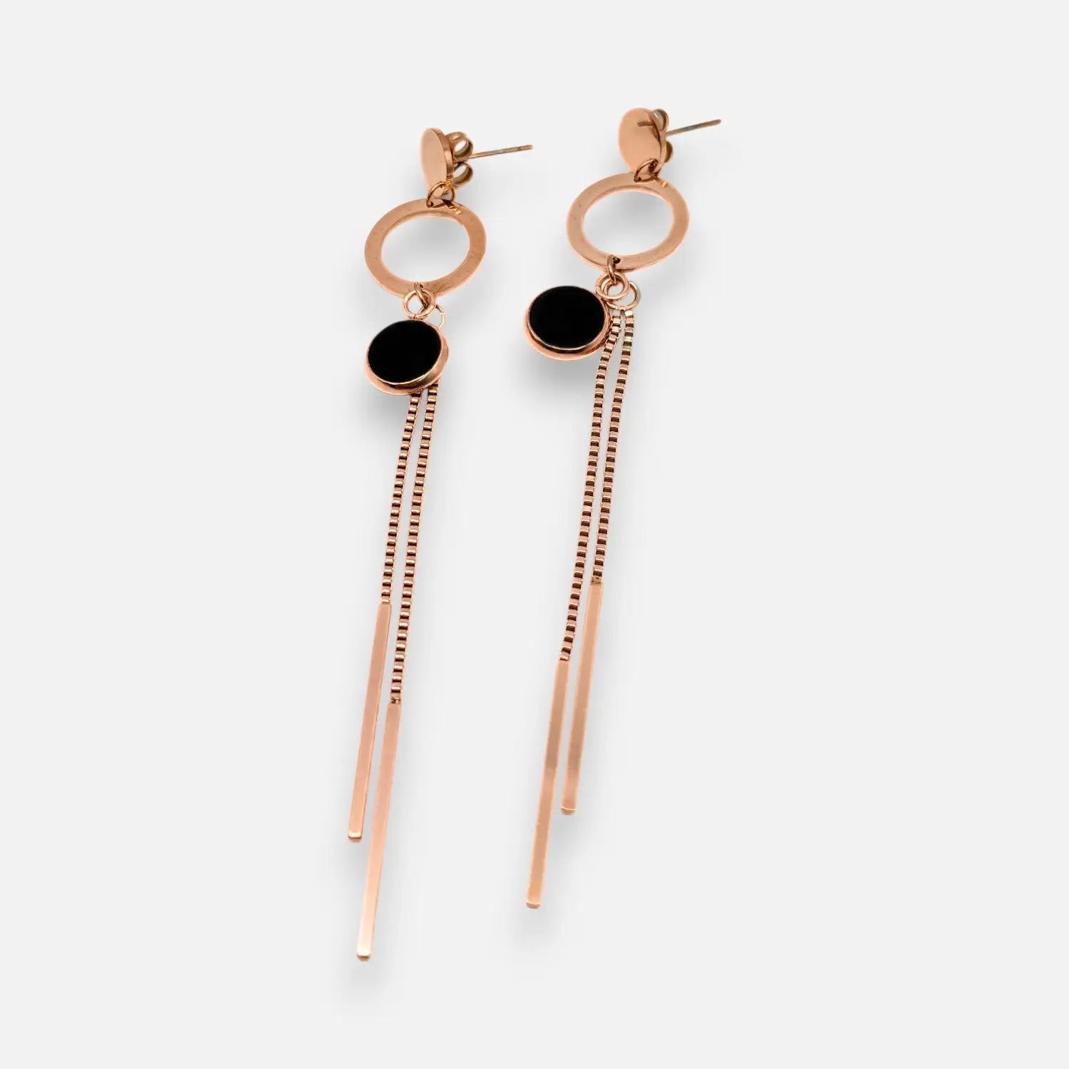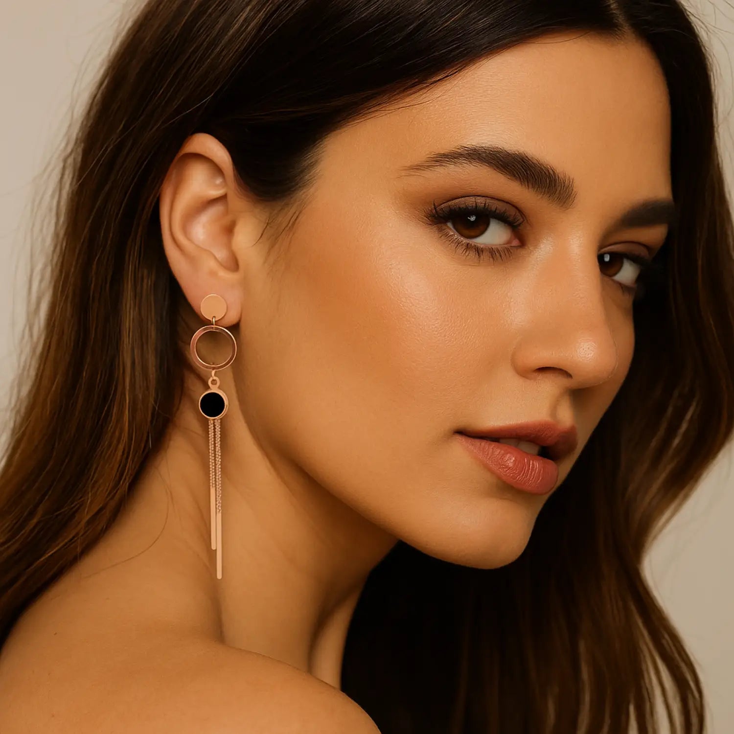 Lange, schicke Quastenohrringe, die in jedem Moment für einen dramatischen Auftritt sorgen. Die dunklen Fäden in Schwarz hängen elegant herab und bieten eine anspruchsvolle Ergänzung zu Abendgarderobe oder Business-Looks.