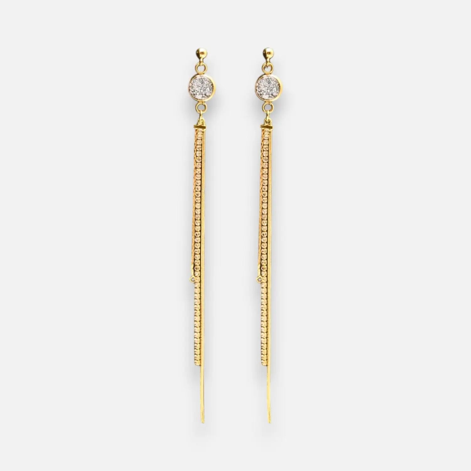 Diese Ohrstecker setzen mit ihren eingefassten Zirkonia in einer 18k vergoldeten Messingfassung funkelnde Akzente. Sie sind 2 cm lang mit einem Durchmesser von 15 mm und stellen eine Balance zwischen Haltbarkeit und Stil dar, perfekt für den täglichen Gebrauch.