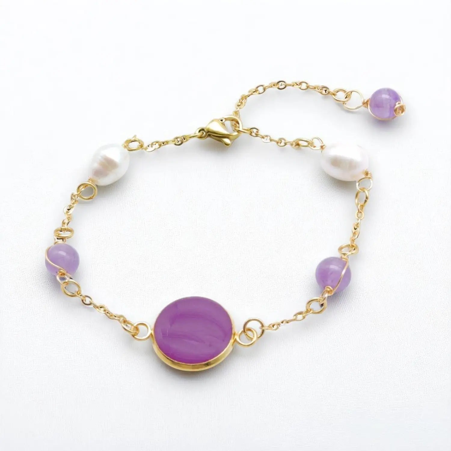 Ankerkette mit 6 mm Perlen & 6 mm Edelsteinen, 18 cm + 5 cm Verlängerung, 14 mm Epoxidschale in Violetttönen, Messing vergoldet.