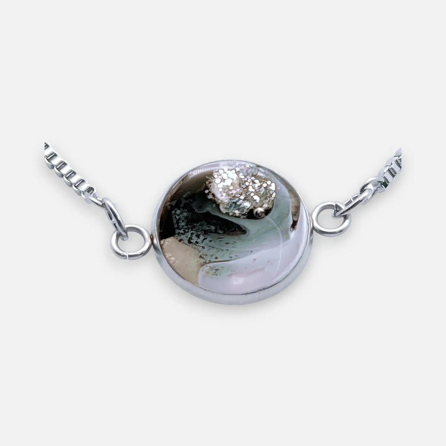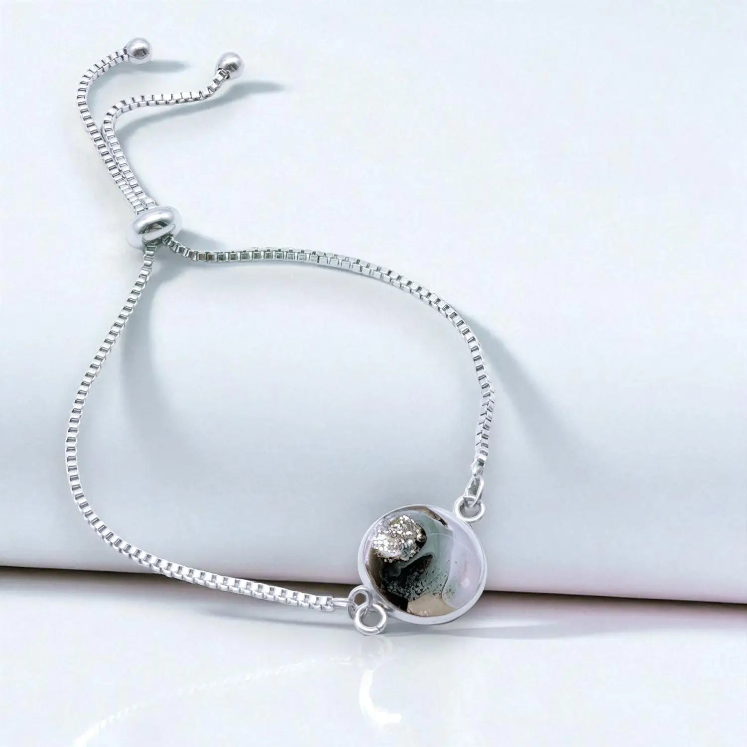 Verstellbare Venezianerkette (bis 24 cm), 14 mm Epoxidschale in Schwarz/Weiß/Silber, 304 Edelstahl nativ, Slider.