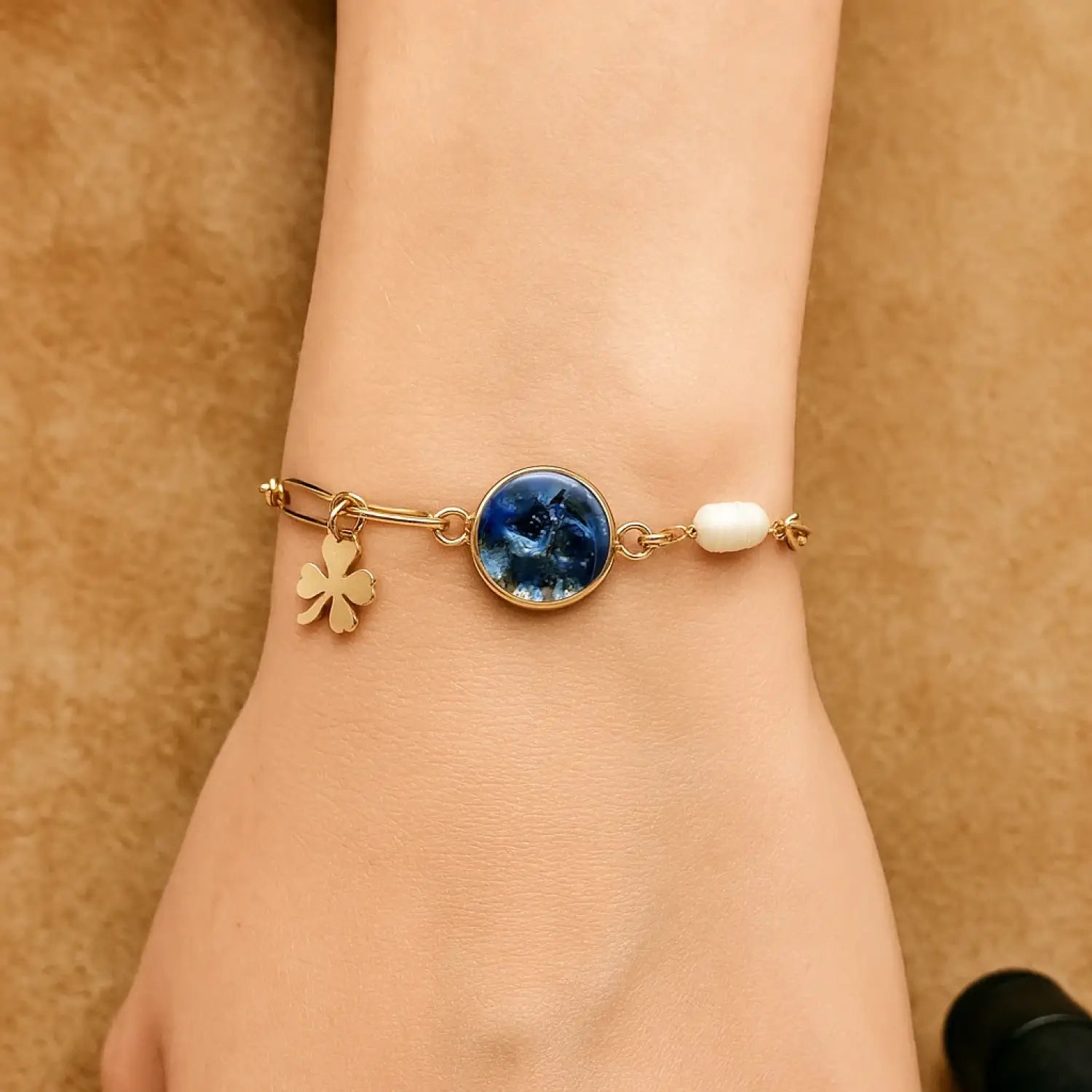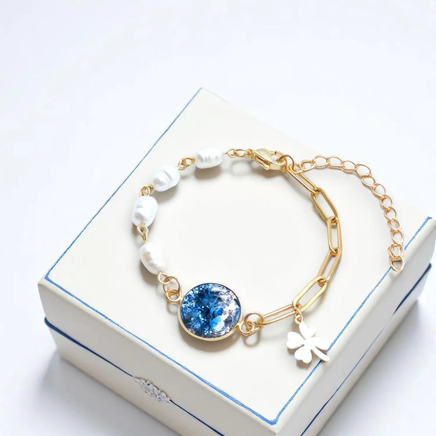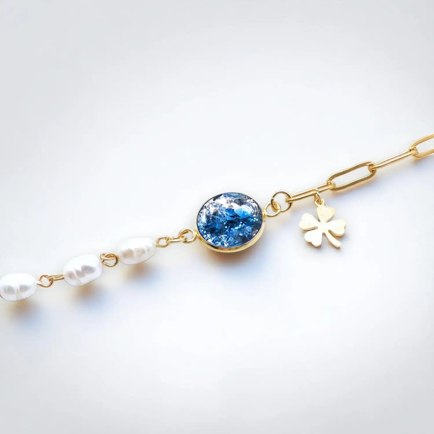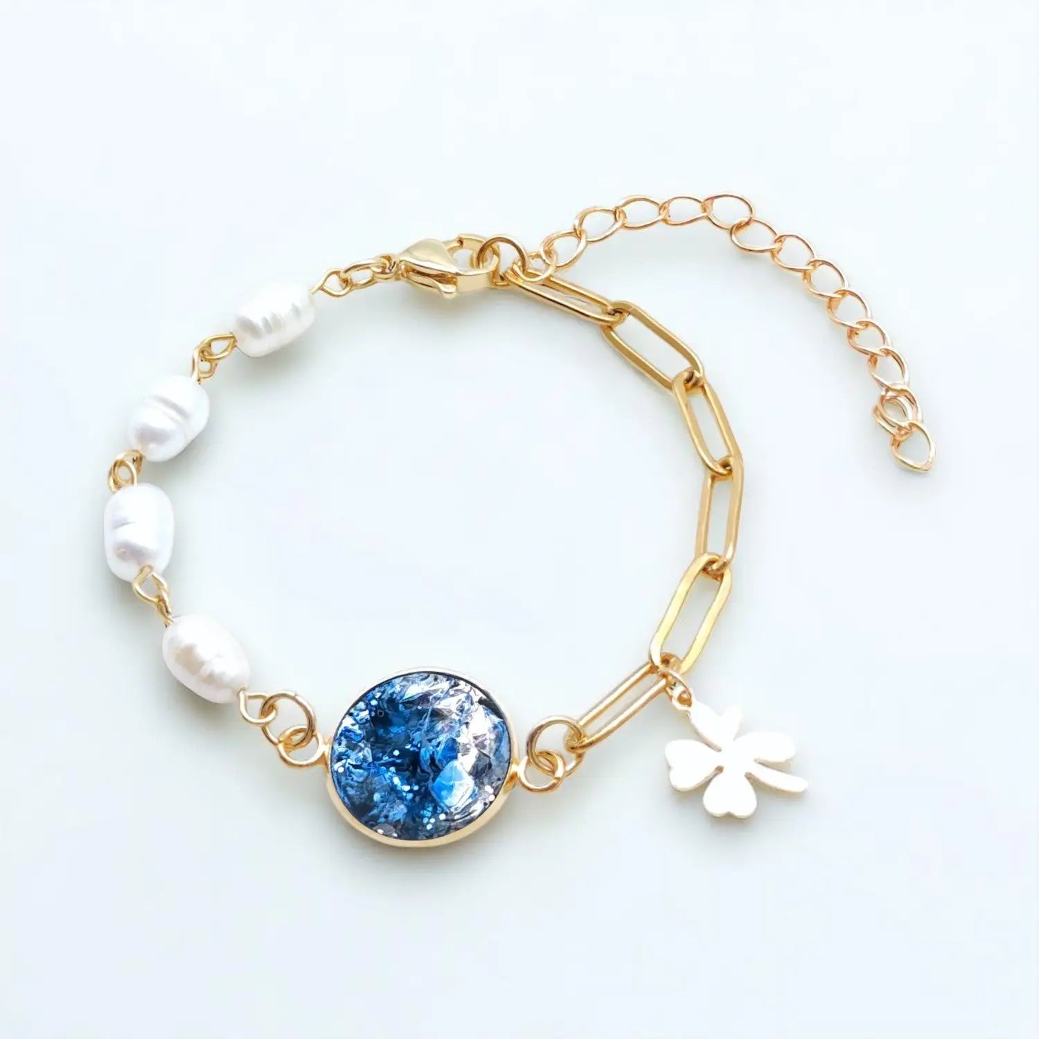 Mix aus Süßwasserperlen & Paperclip, 16 cm + 6 cm Verlängerung, 14 mm Epoxidschale in Blau/Silber, 304-Edelstahl vergoldet.