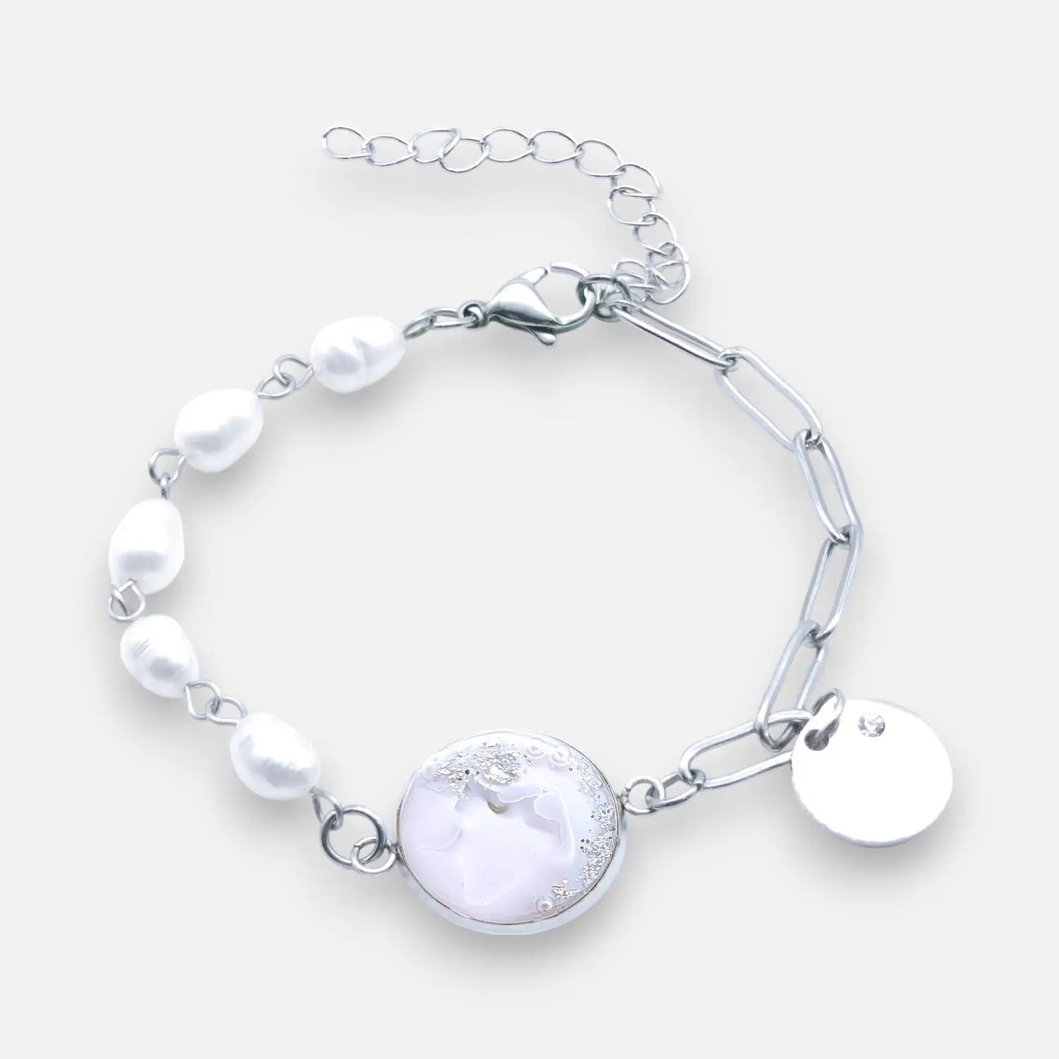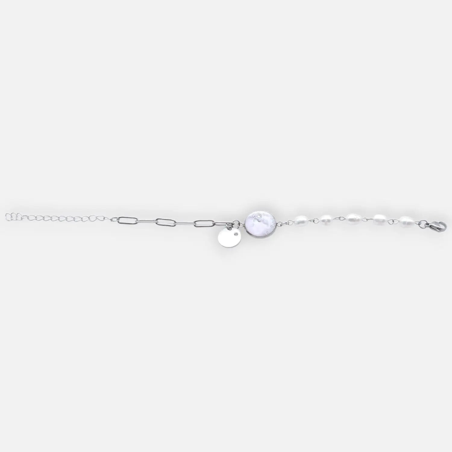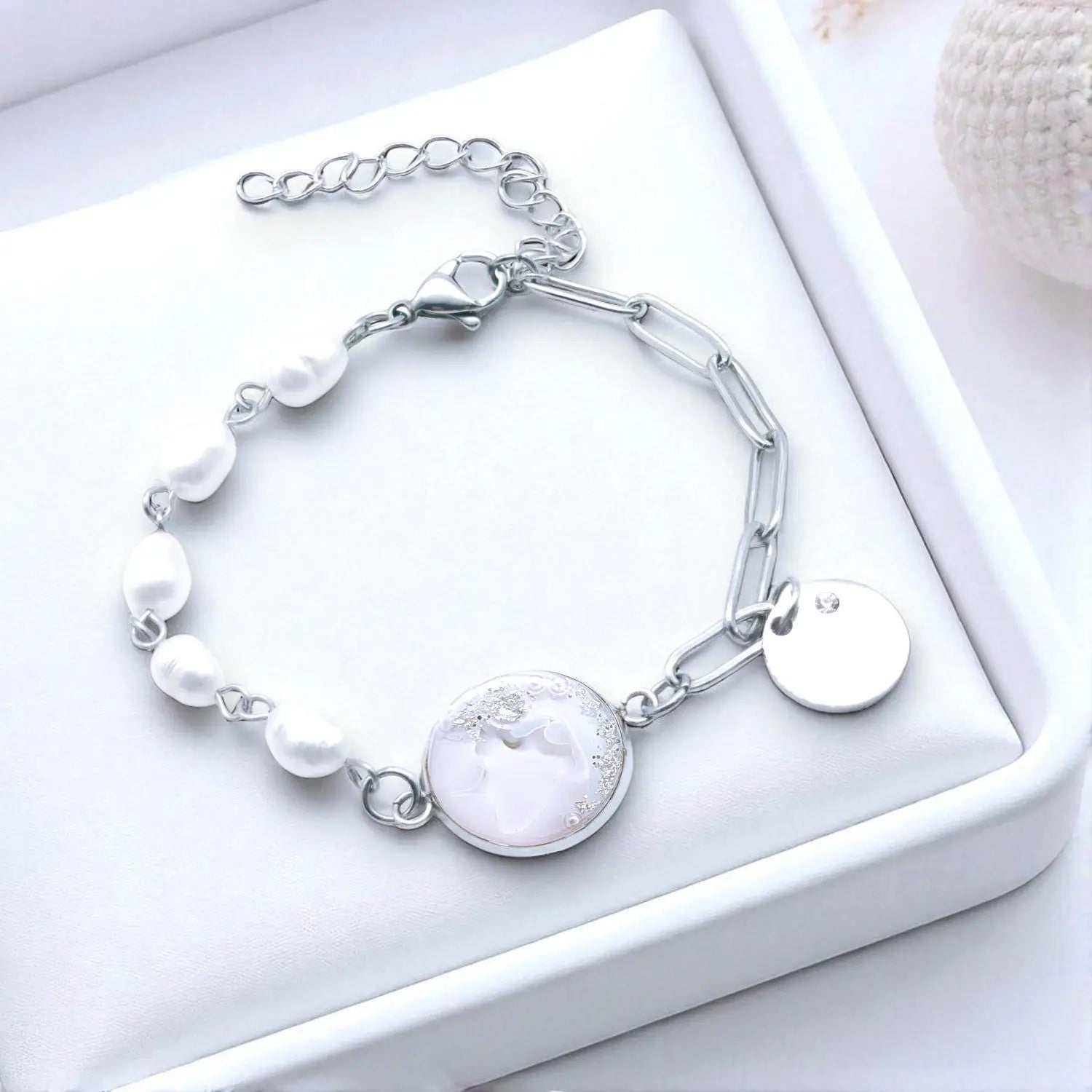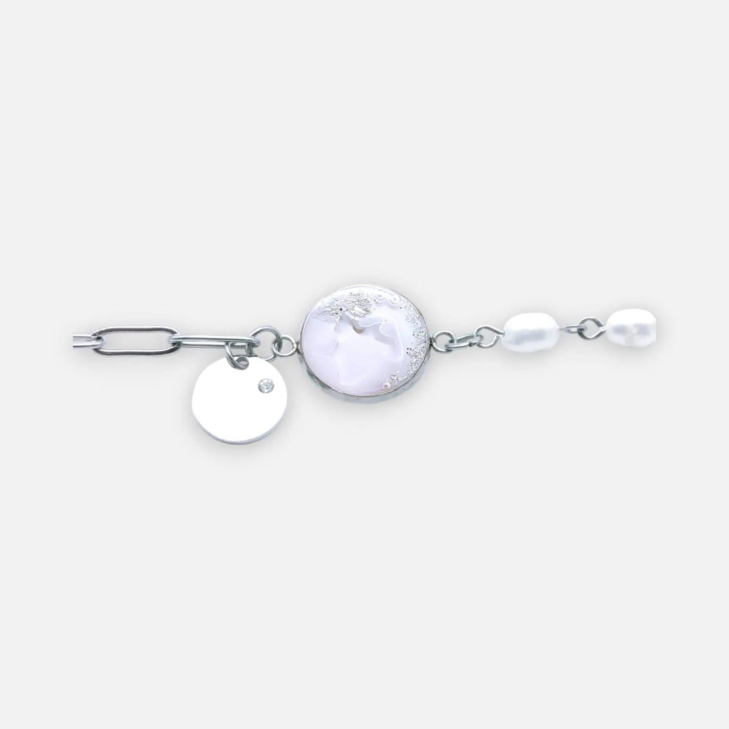 Mix aus Süßwasserperlen & Paperclip, 17 cm + 6 cm Verlängerung, 16 mm Epoxidschale in Weiß/Silber, Zirkonia-Anhänger, 304 Edelstahl nativ, Karabiner.