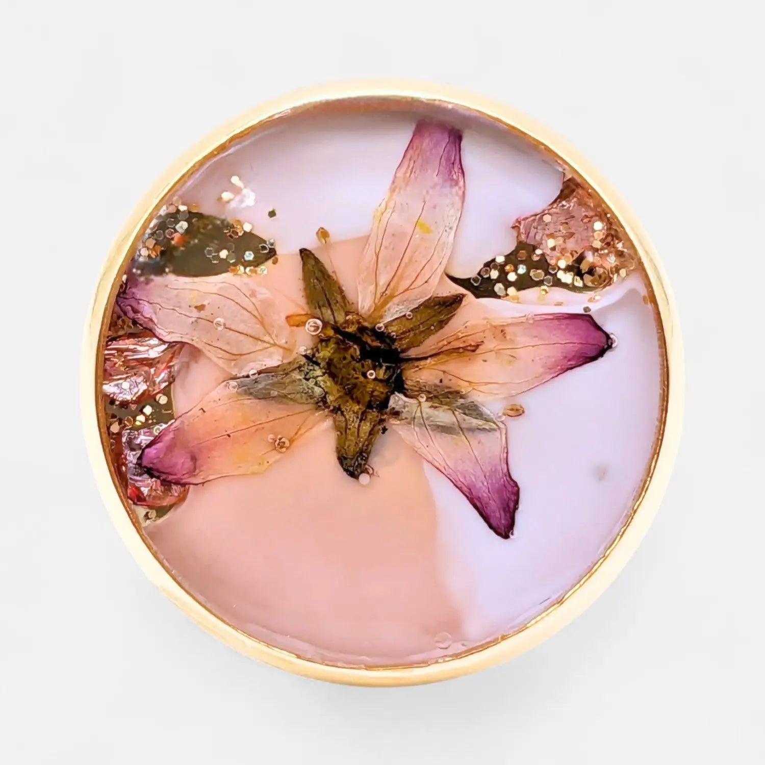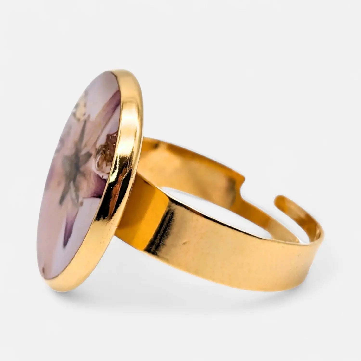 Der Floral Elegance Ring ist ein bezaubernder, verstellbarer Ring aus vergoldetem 304 Edelstahl. Die Epoxidschale des Rings ist mit einer Kombination aus beigen und weißen Farben gestaltet und enthält eine zarte lila Trockenblume. Dieser Ring strahlt feminine Eleganz aus und verleiht deinem Outfit eine romantische Note. Mit einem Durchmesser von 16 mm ist er ein perfektes Accessoire für jeden Anlass.