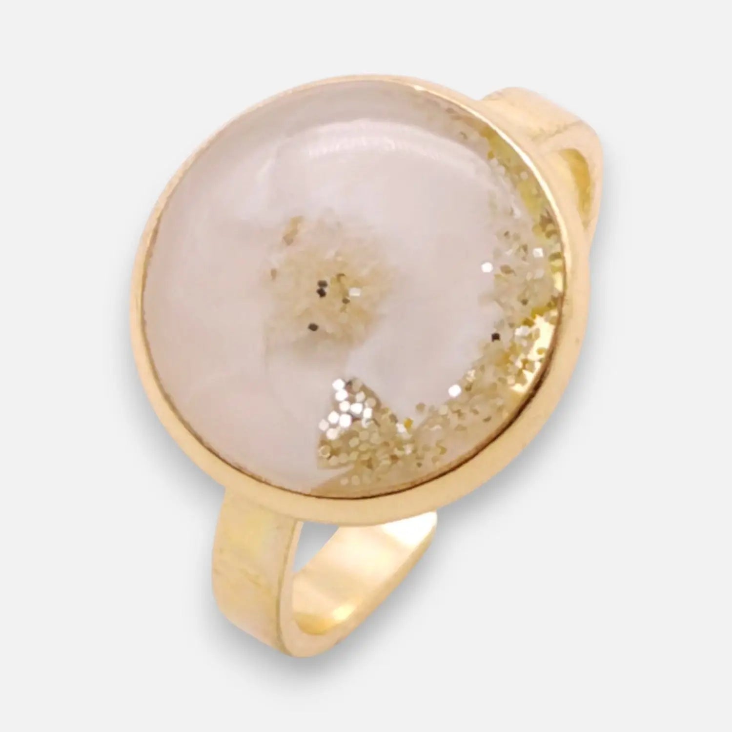 Verstellbarer, vergoldeter 304-Edelstahlring mit 12 mm Epoxidkugel in Weißtönen.