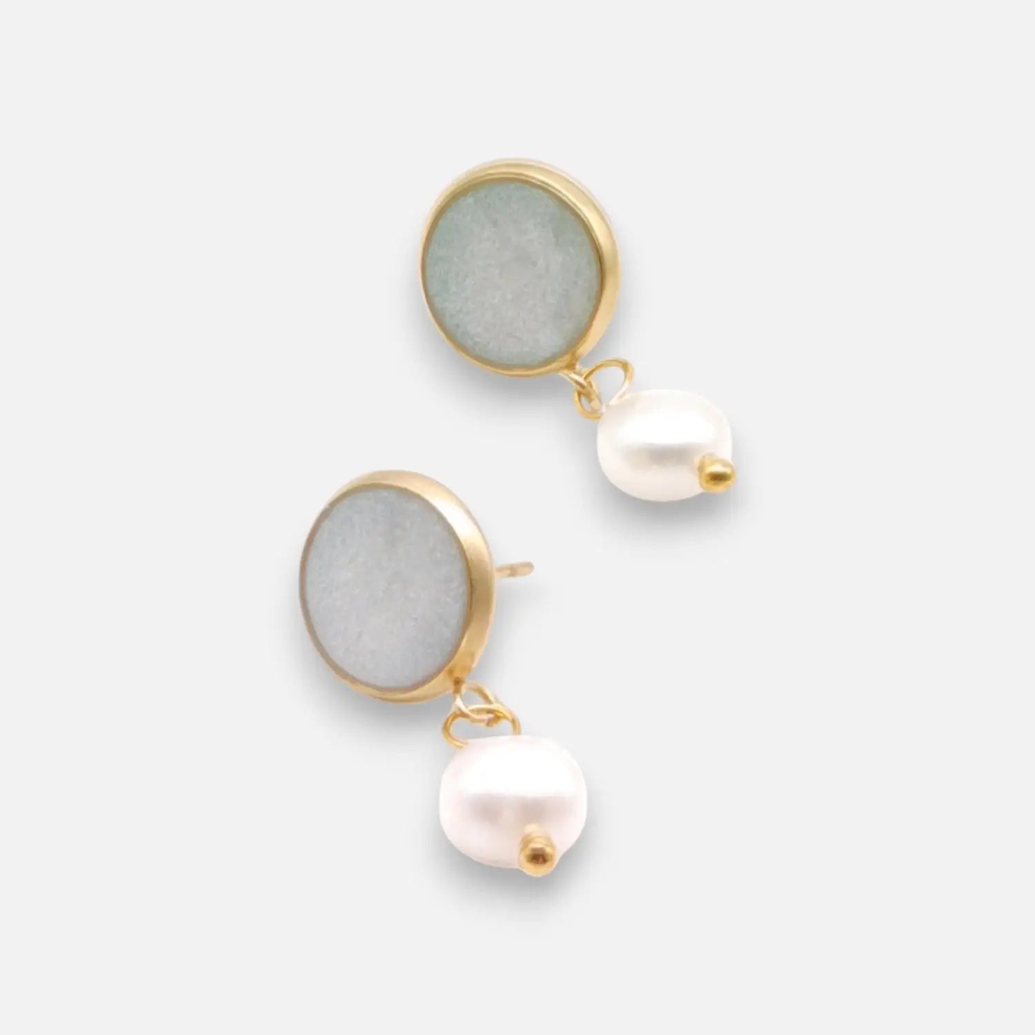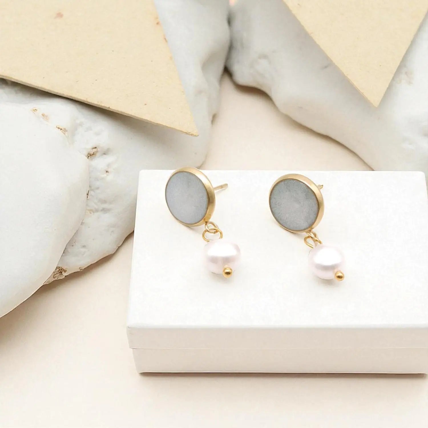 Gold plated 304 stainless steel stud earrings, 2.5 cm, 10 mm epoxy shell in silver, natural freshwater pearl charms.