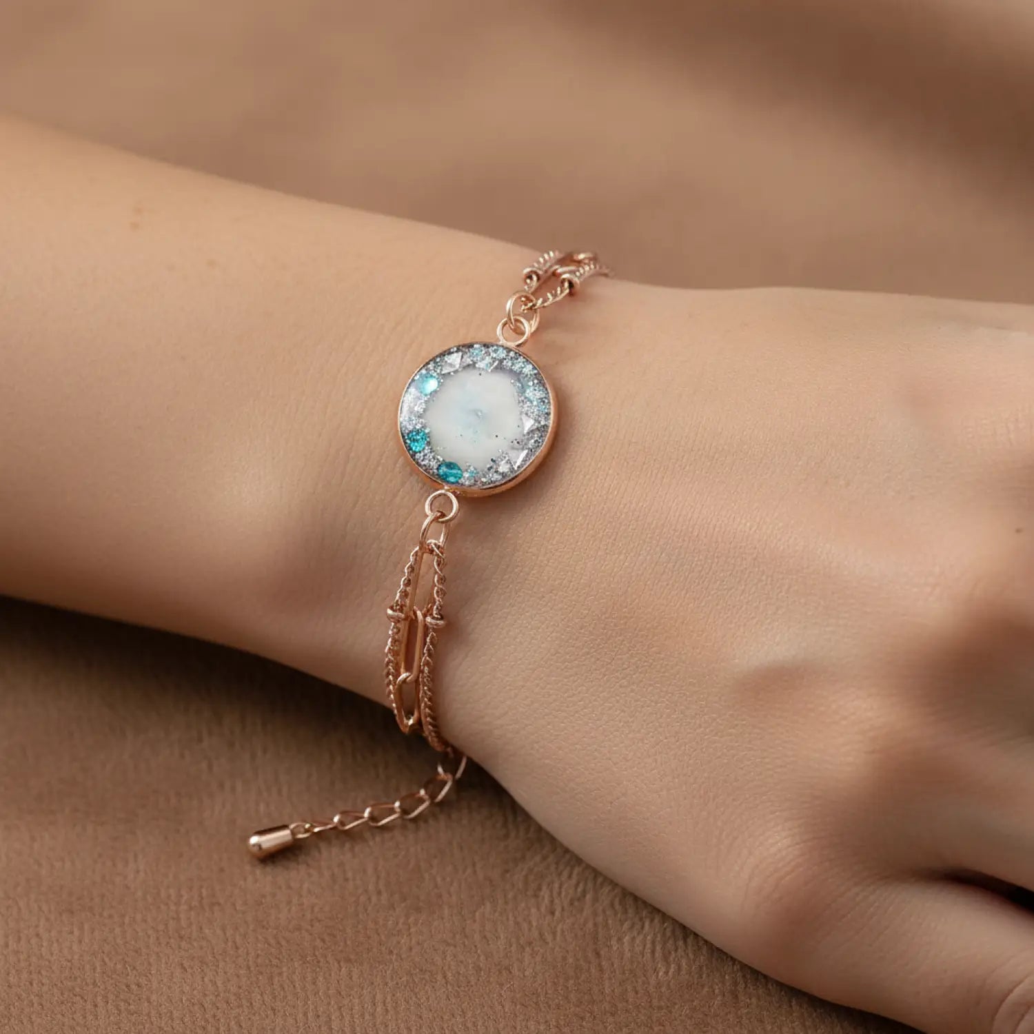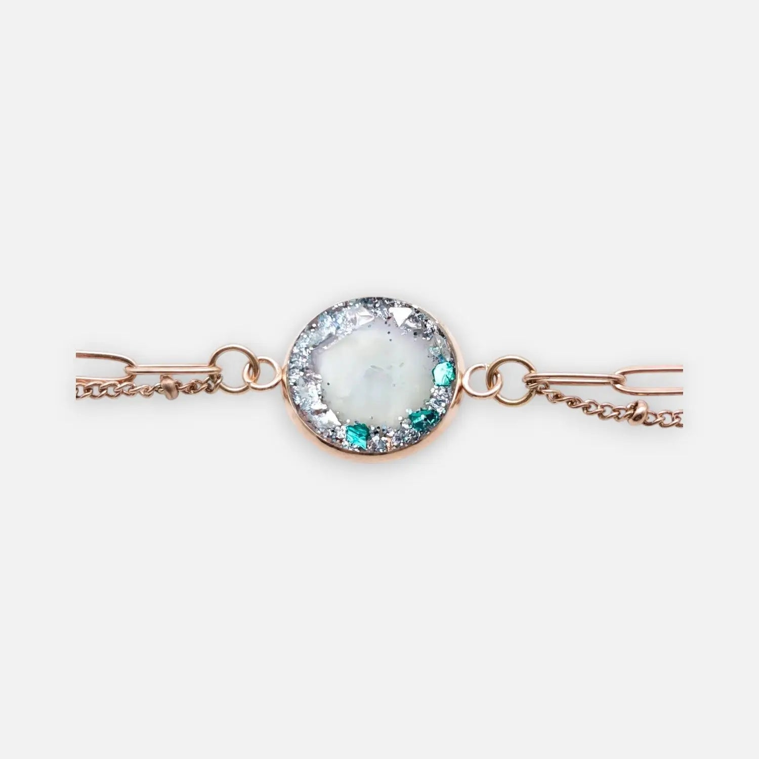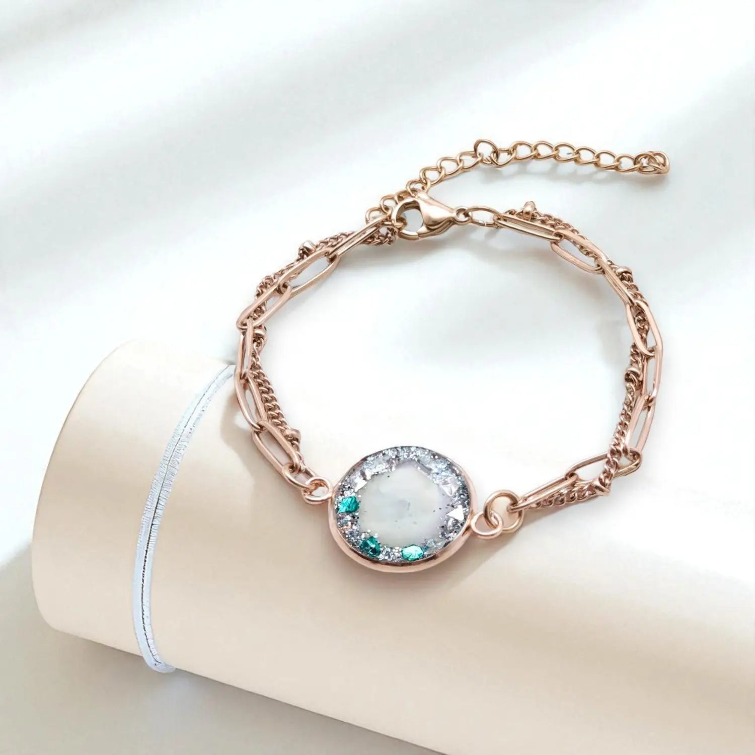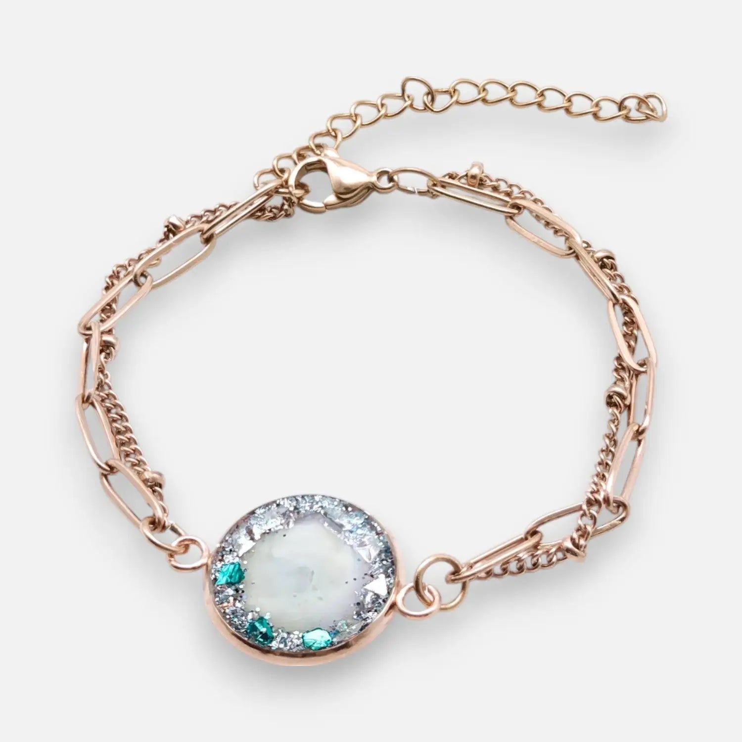Double layer, 17 cm + 5 cm extension, 16 mm epoxy shell in white/silver, 304 stainless steel rose gold plated.
