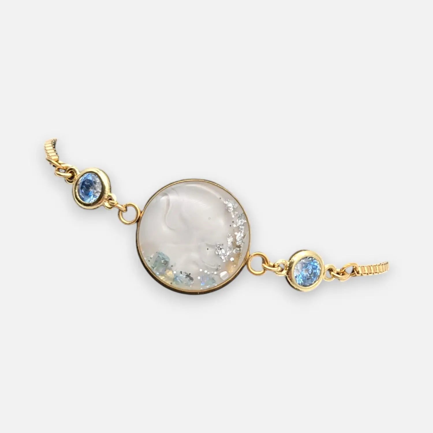 Blue accents and silver details blend into this delicate creation with a white epoxy shell.