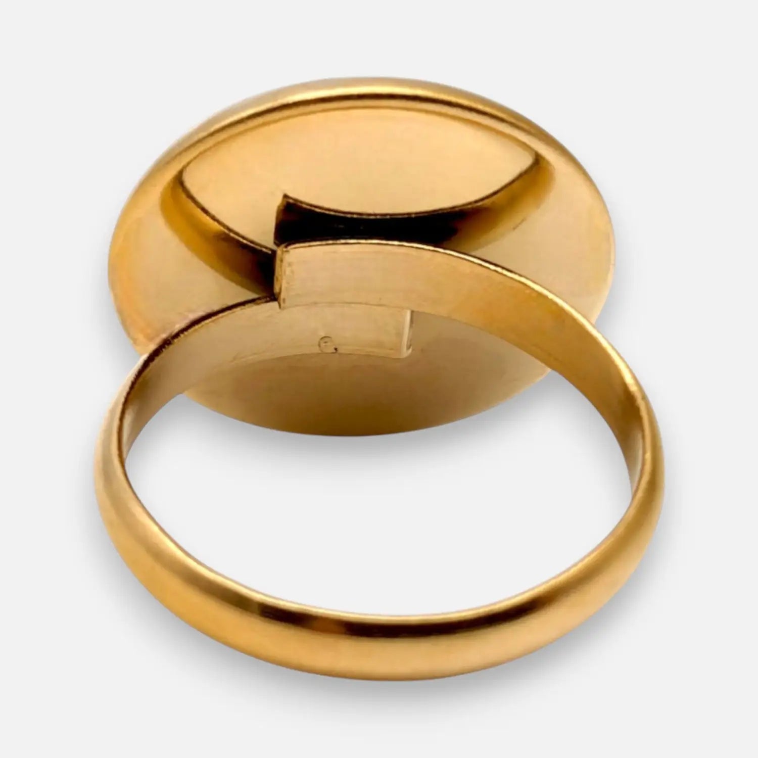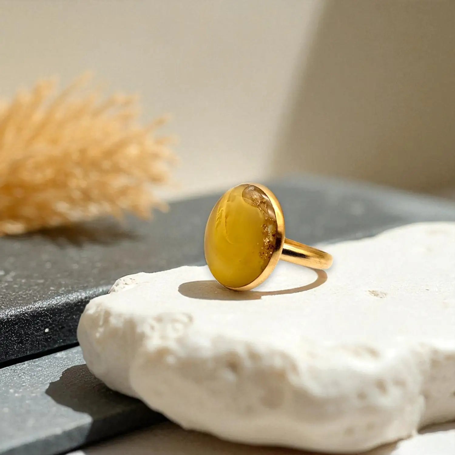 A vibrant ring in shades of yellow, gold and translucent, designed at 18mm diameter in an adjustable size. It is made of 304 gold plated stainless steel, which promises durability.