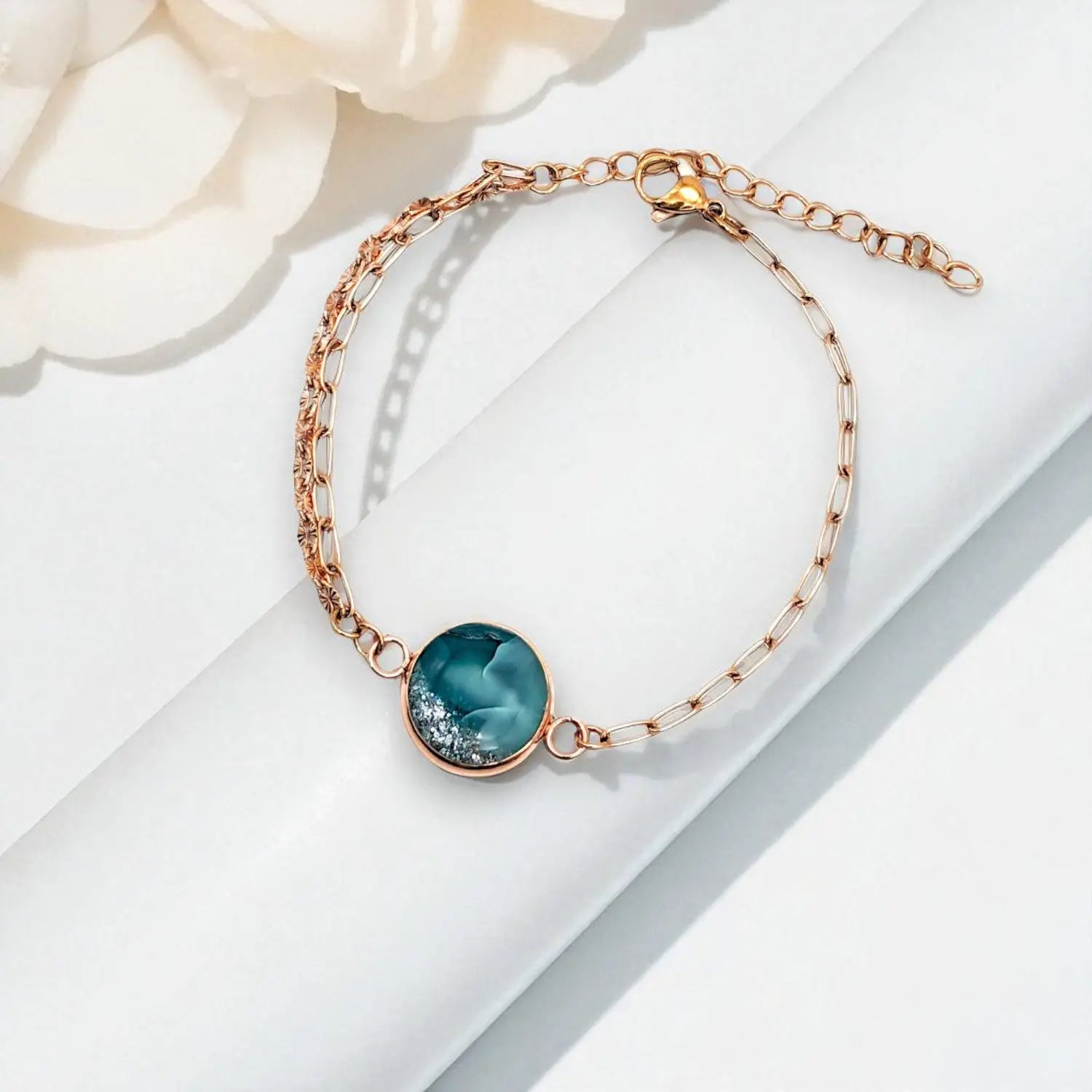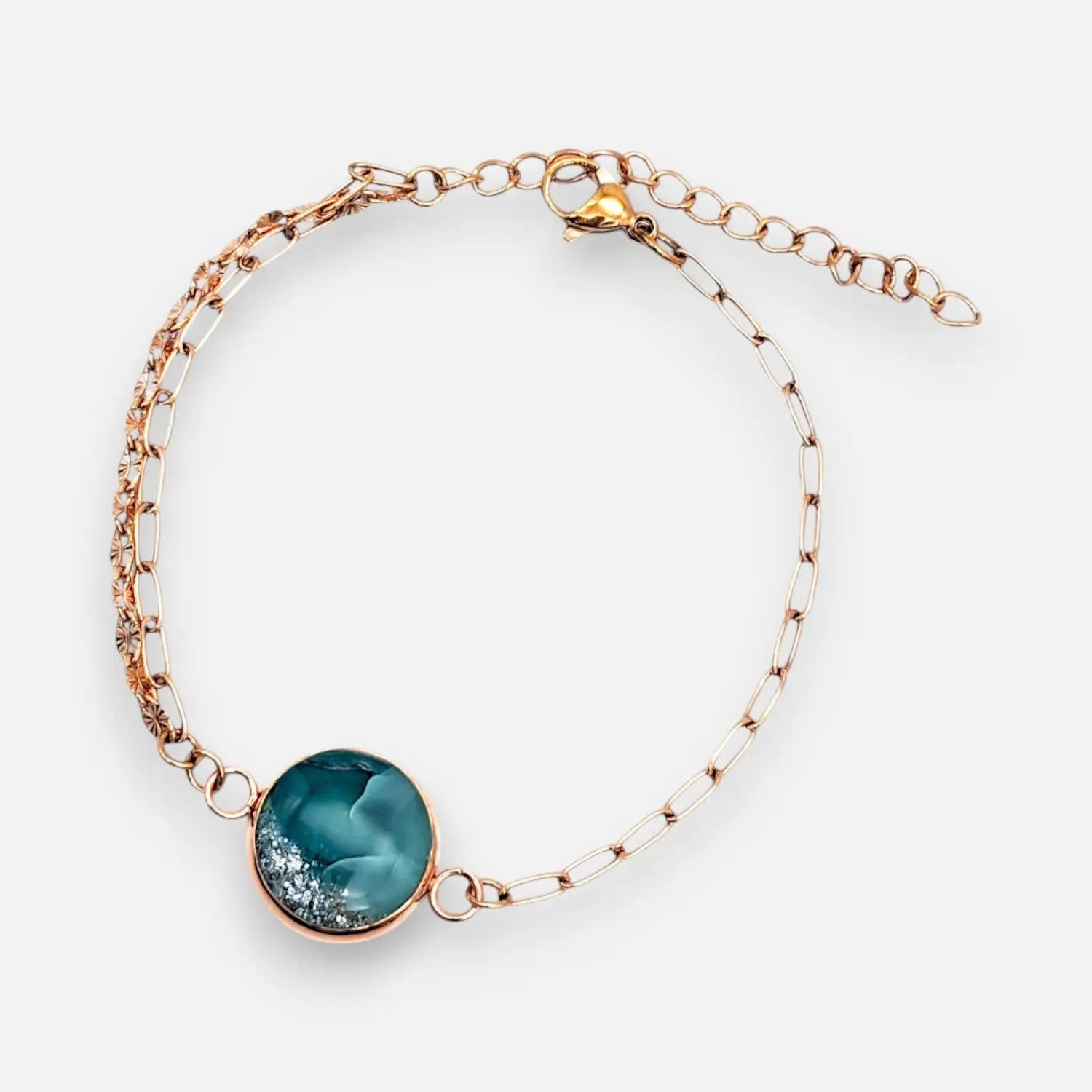 An exquisite combination of green tones and silver characterizes this 15 cm long double-layer paperclip bracelet. The rose gold-plated 304 stainless steel construction makes it a coveted piece in any collection.