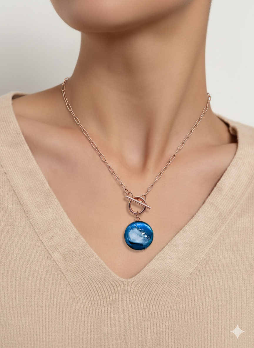 The blue tones of this 50 cm long paperclip necklace are reminiscent of a still body of water, calming and deep.
