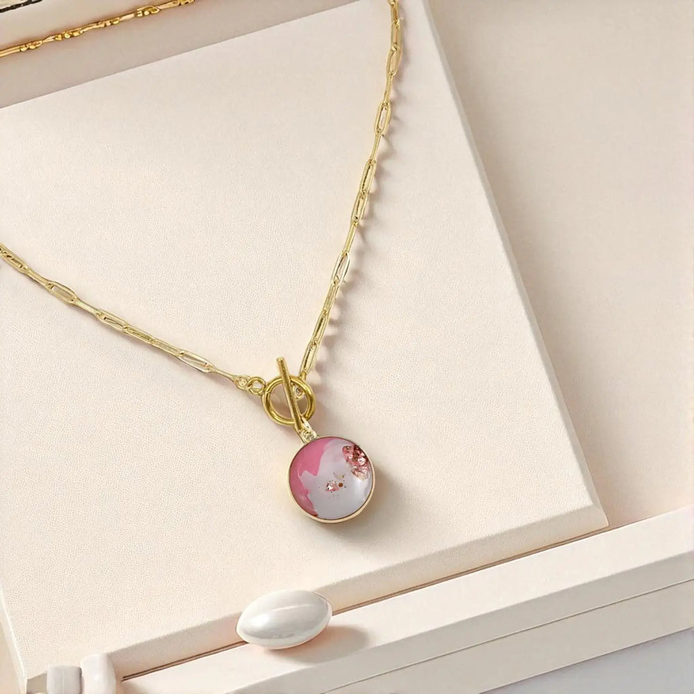 This paperclip necklace with blue and white tones has an epoxy shell with a diameter of 20 mm and a chain thickness of 3.5 mm. Made of native 304 stainless steel. Necklace length: 47 cm. Clasp type: toggle clasp.