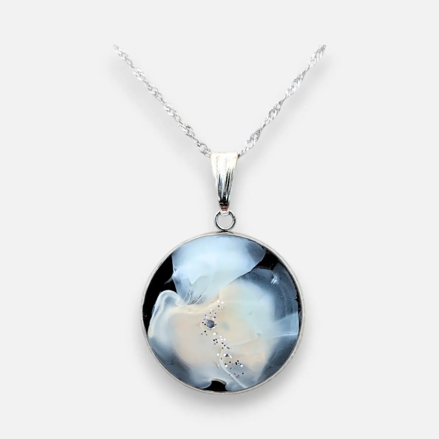 The Midnight Black Necklace is a cord necklace with an epoxy shell in