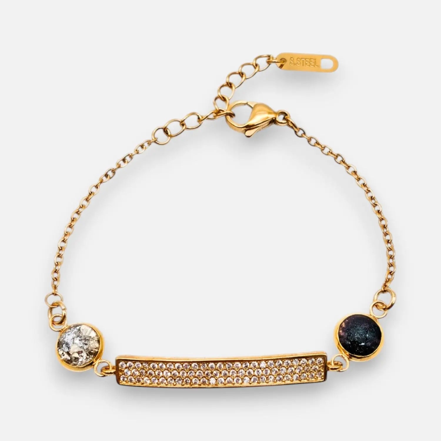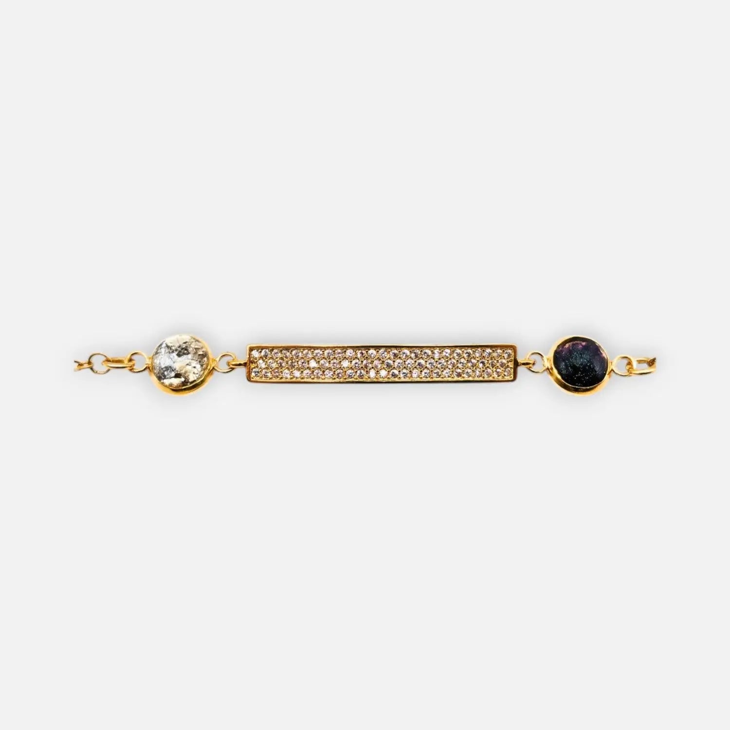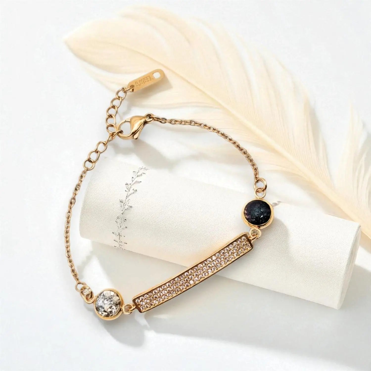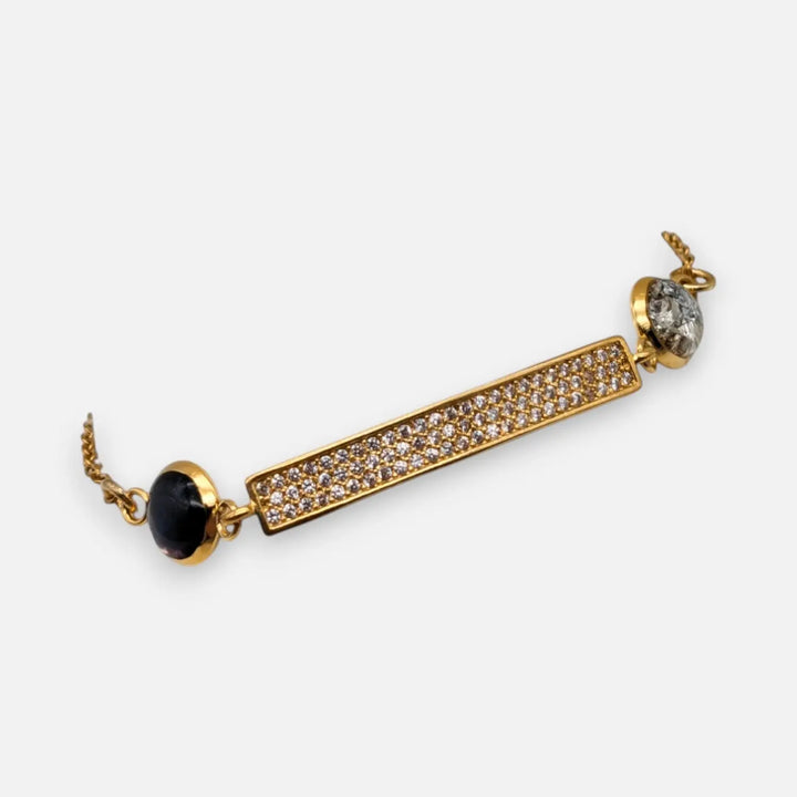 This exquisite bracelet features a rectangular 18k gold-plated brass piece with cubic zirconia, measuring 4.5 mm wide, 37 mm long and 4.5 mm deep. It has a 14 cm long anchor chain with a 3 cm extension, a Bezel cup of 6/6 mm diameter and a chain thickness of 1.5 mm. The piece of jewelry made of gold-plated 304 stainless steel is equipped with a snap fastener clasp that offers both security and style.