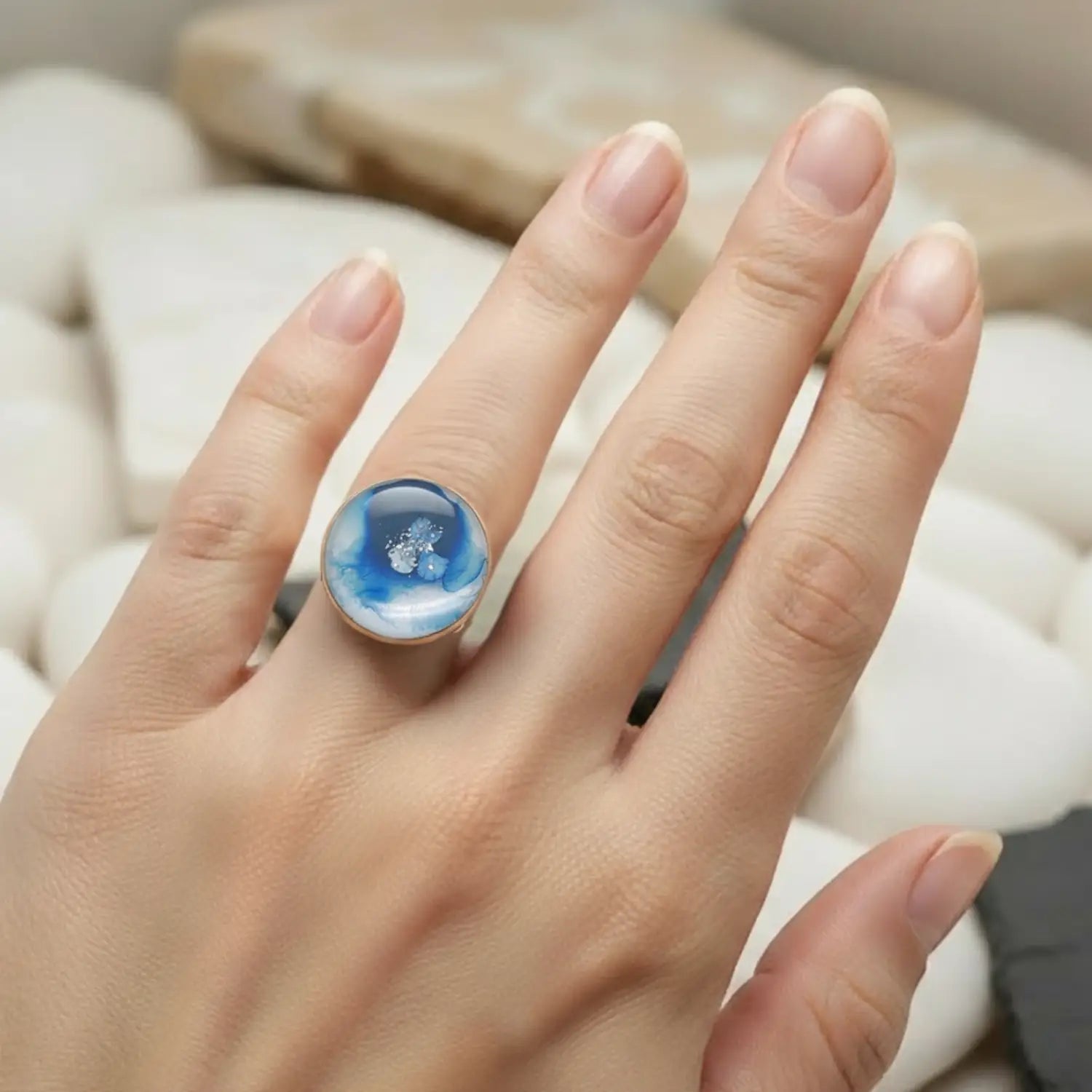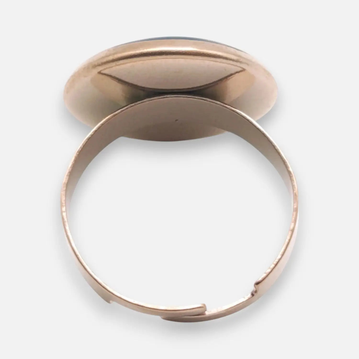 Bague réglable en acier inoxydable 304 plaqué or rose avec coque époxy bleu/blanc/argent de 16 mm.
