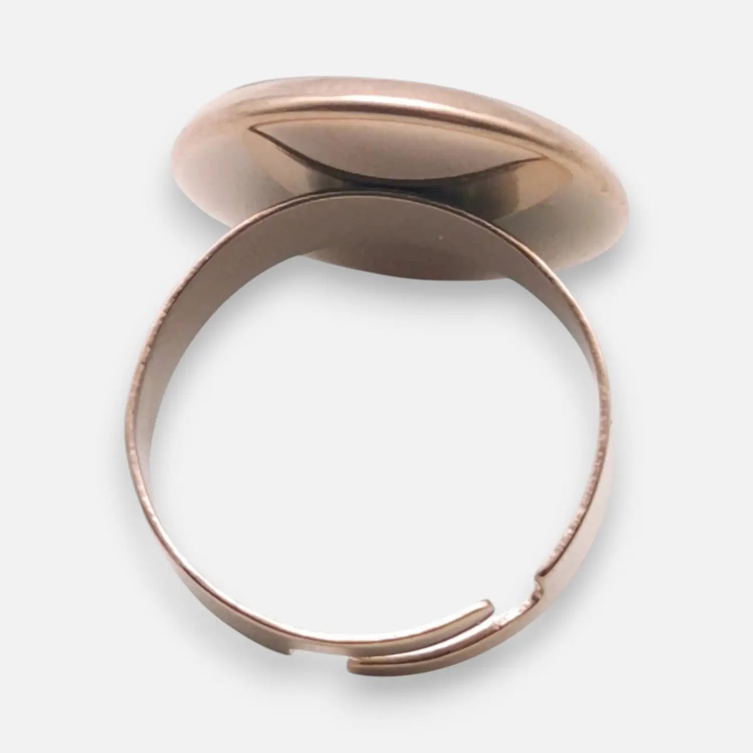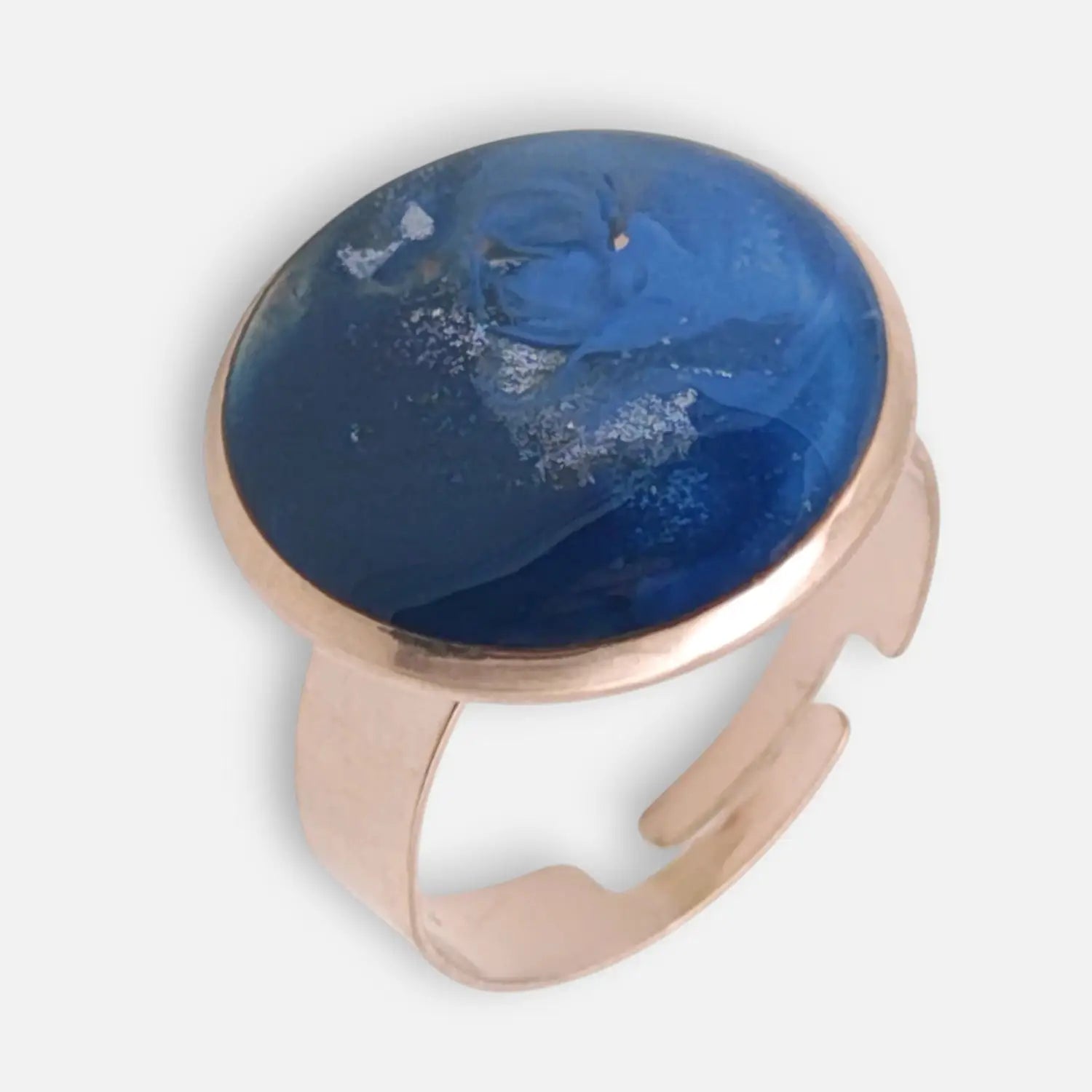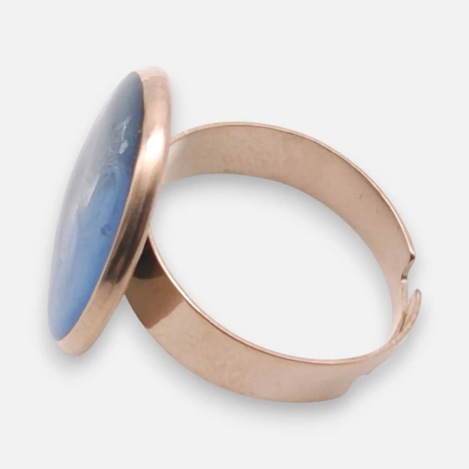 Bague réglable en acier inoxydable 304 plaqué or rose avec coque époxy bleu/argent de 16 mm.