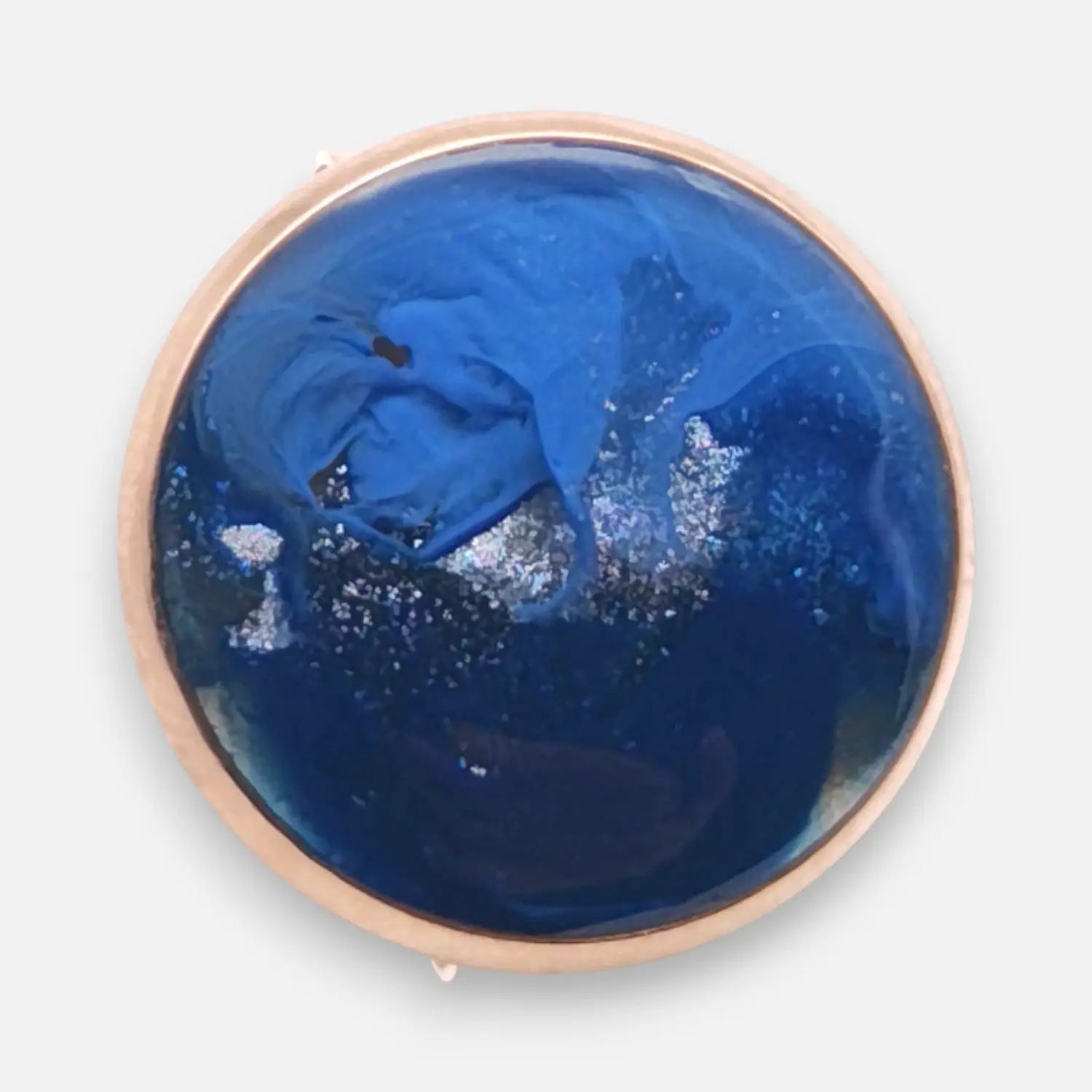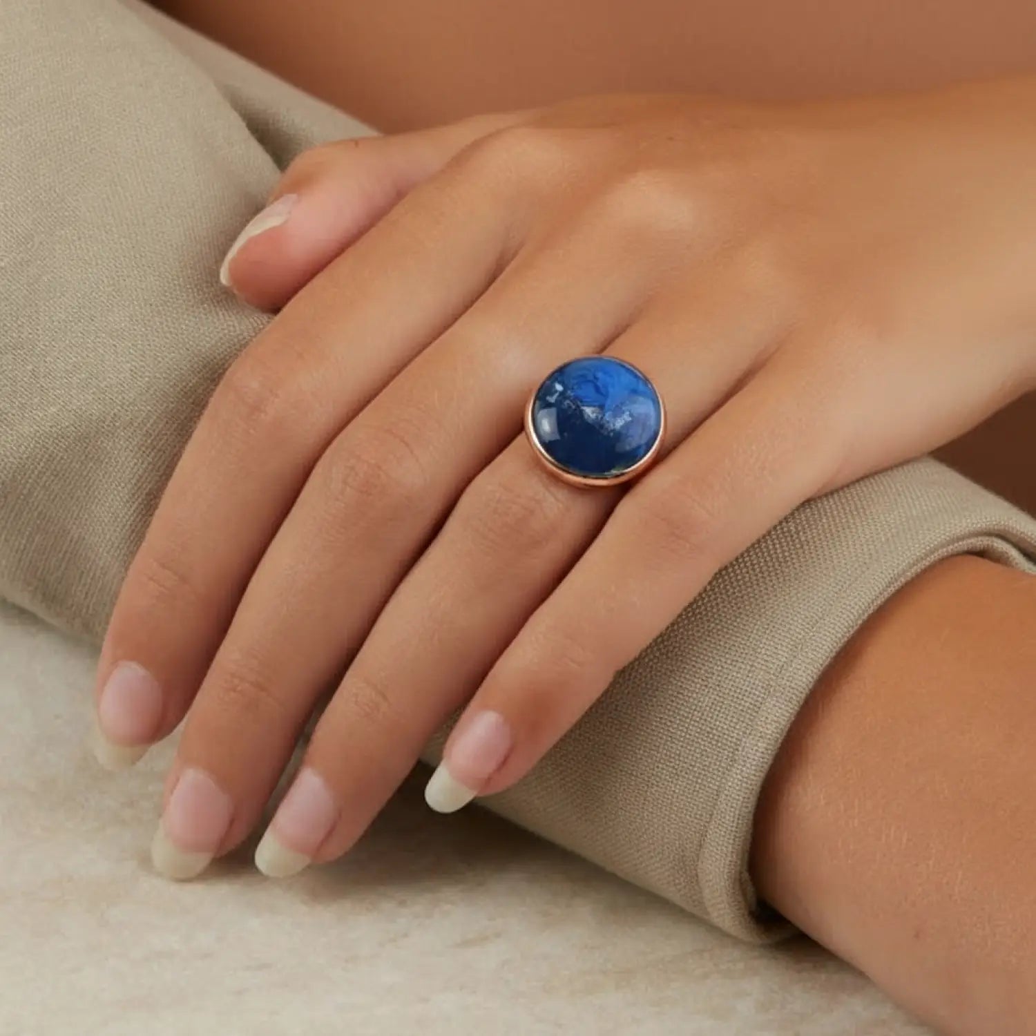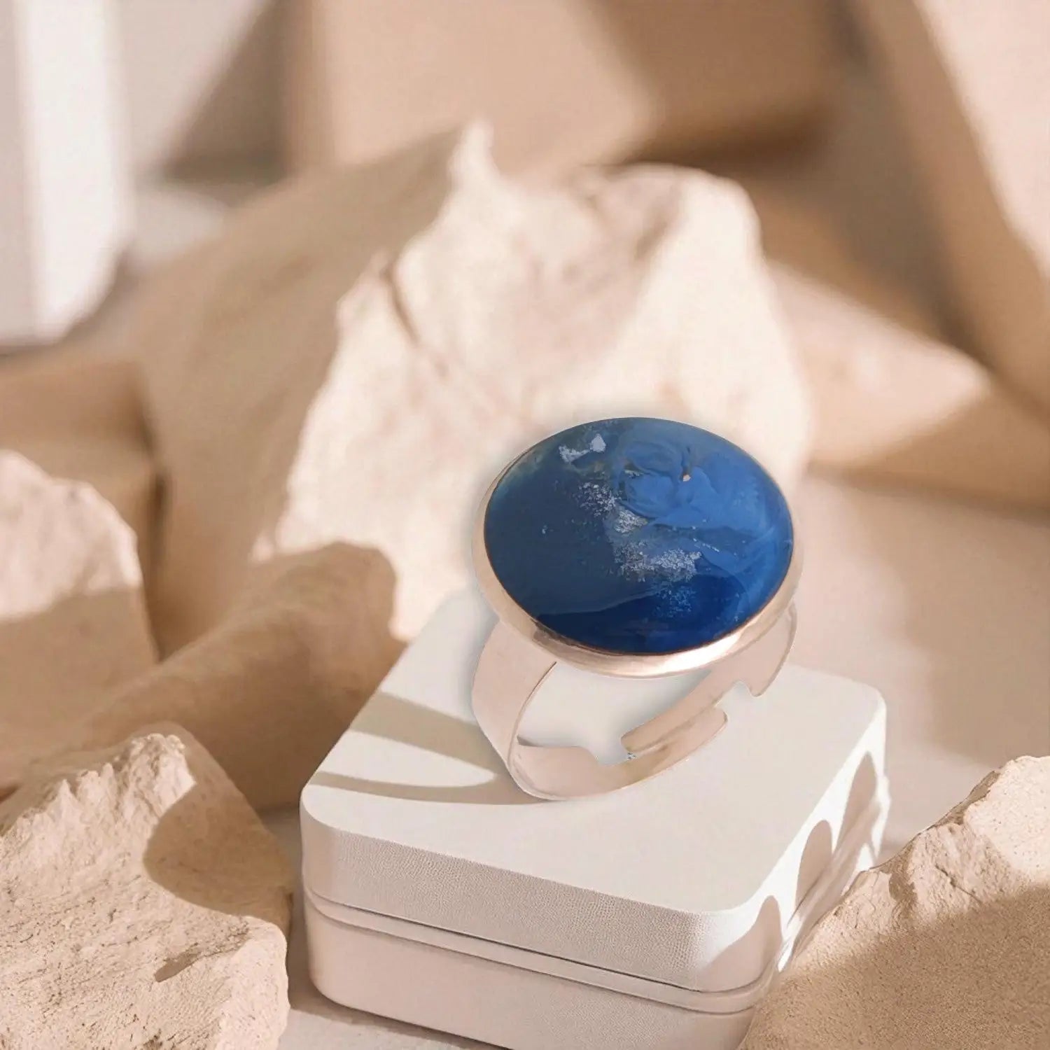 Bague réglable en acier inoxydable 304 plaqué or rose avec coque époxy bleu/argent de 16 mm.