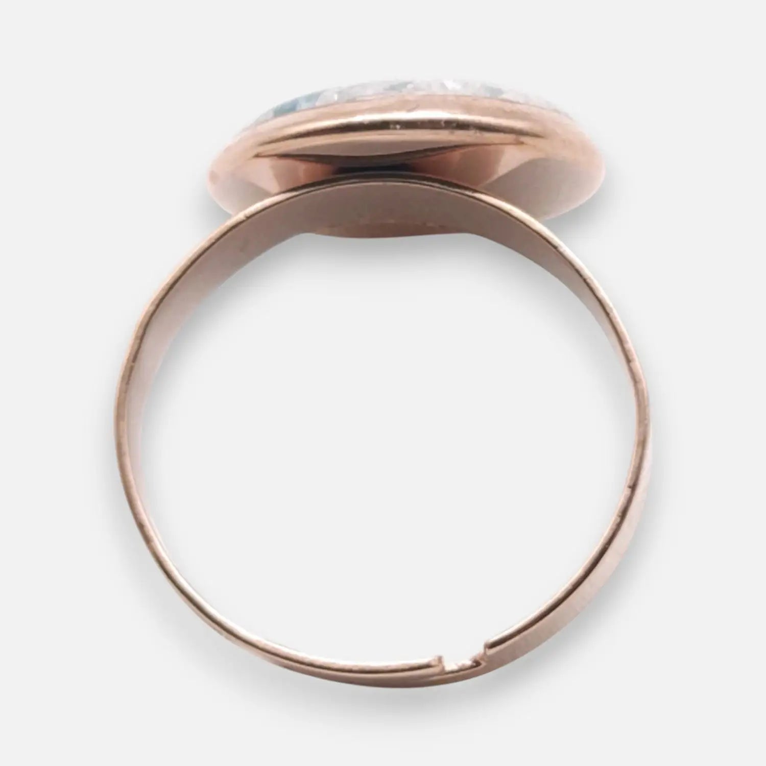 Bague réglable en acier inoxydable 304 plaqué or rose avec coque époxy bleue/translucide/argentée de 12 mm.