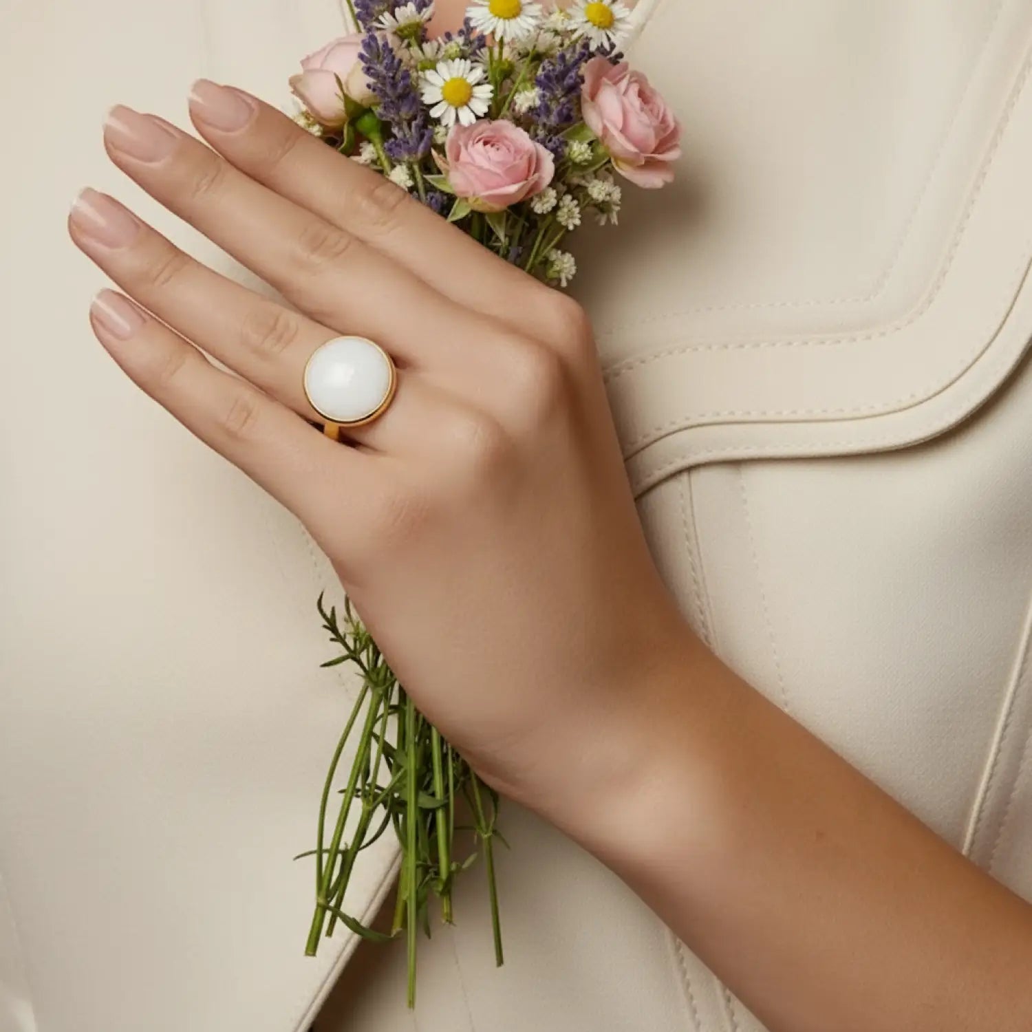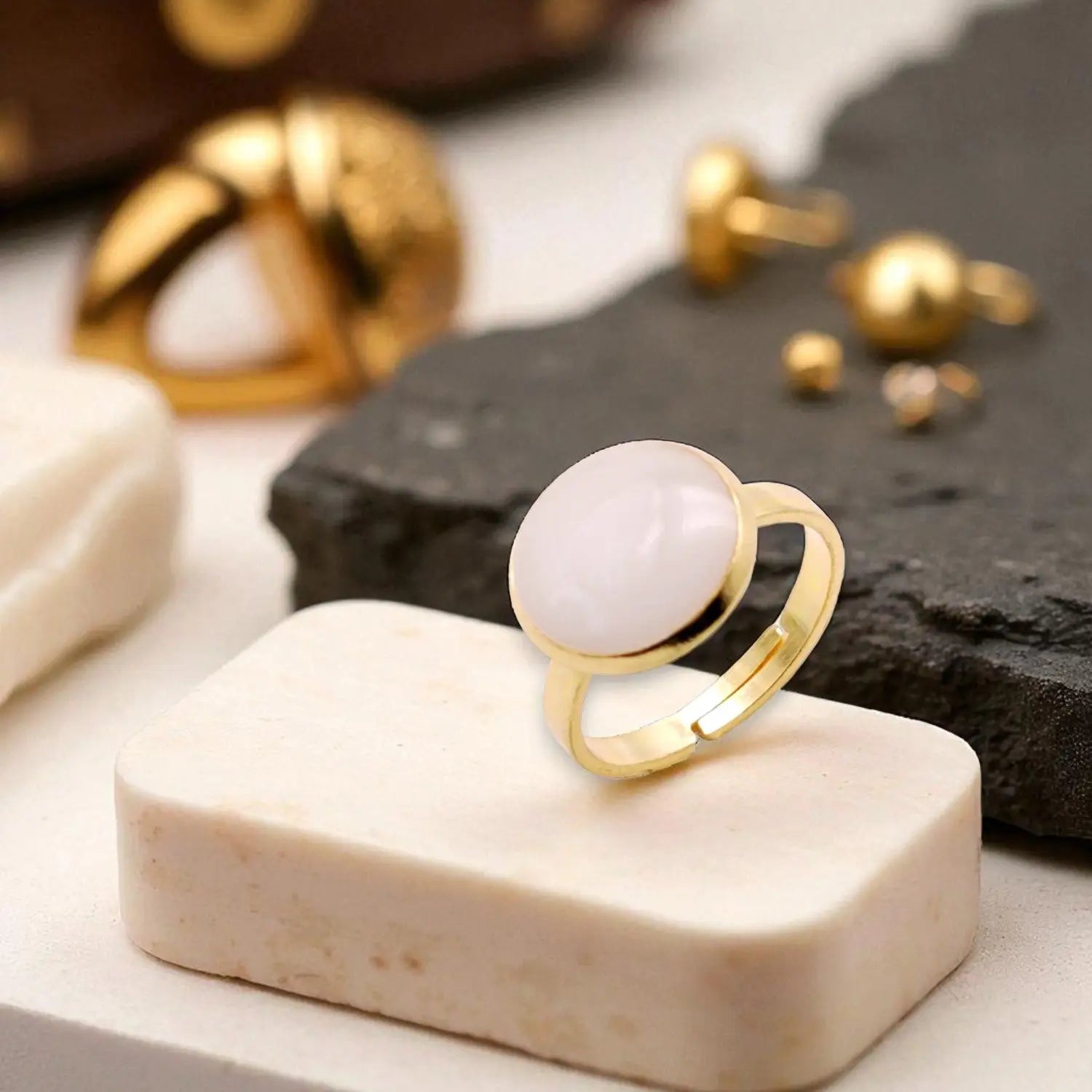 Bague réglable en acier inoxydable 304 plaqué or avec boule époxy de 12 mm dans les tons blancs.