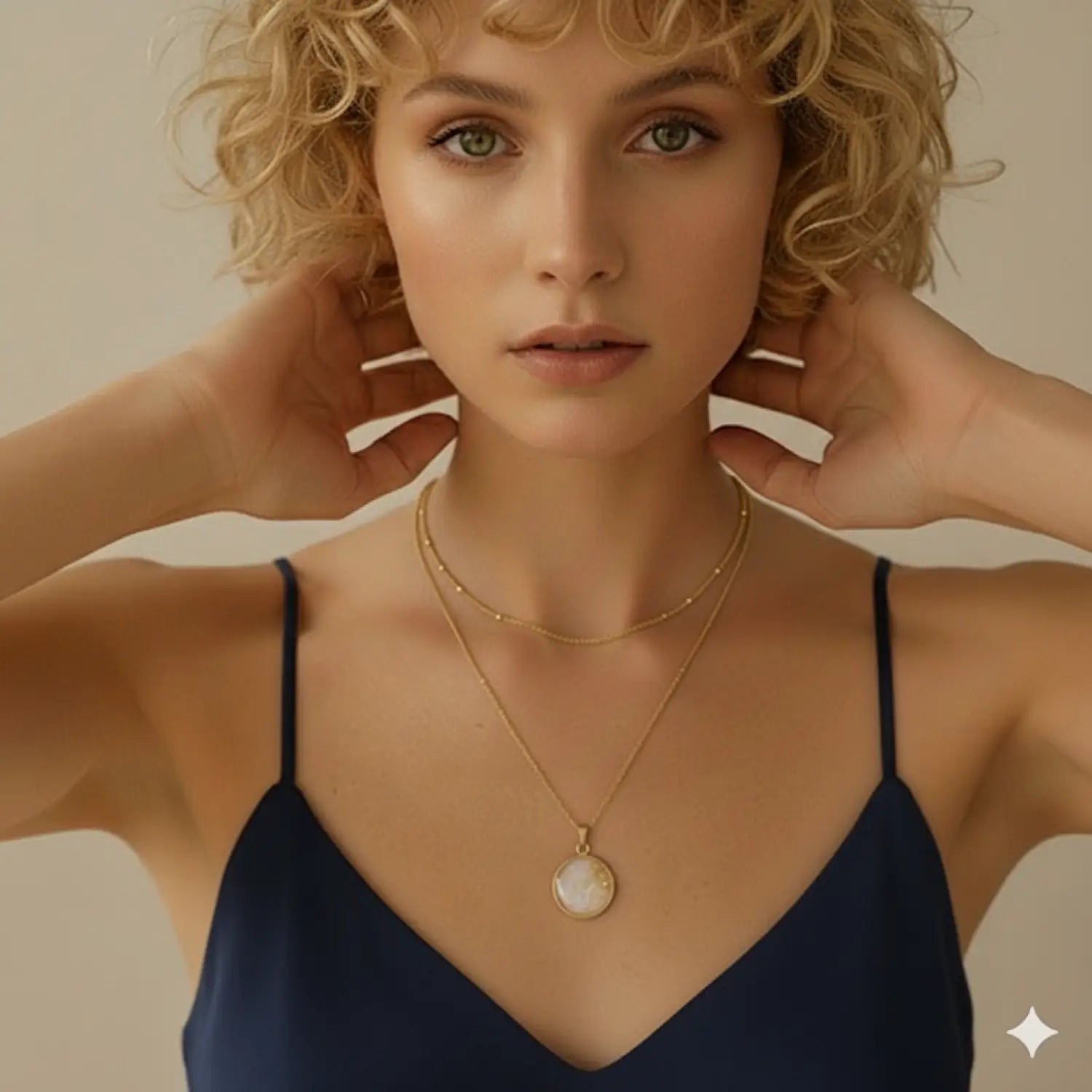 Collier délicat à deux brins dans des tons blancs chauds, beiges et dorés avec une coque en résine époxy de haute qualité.
