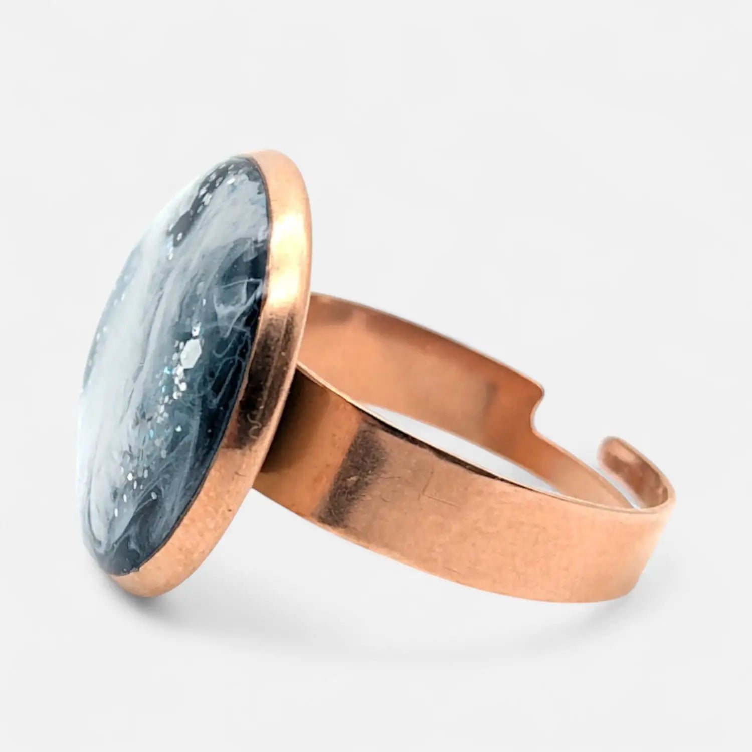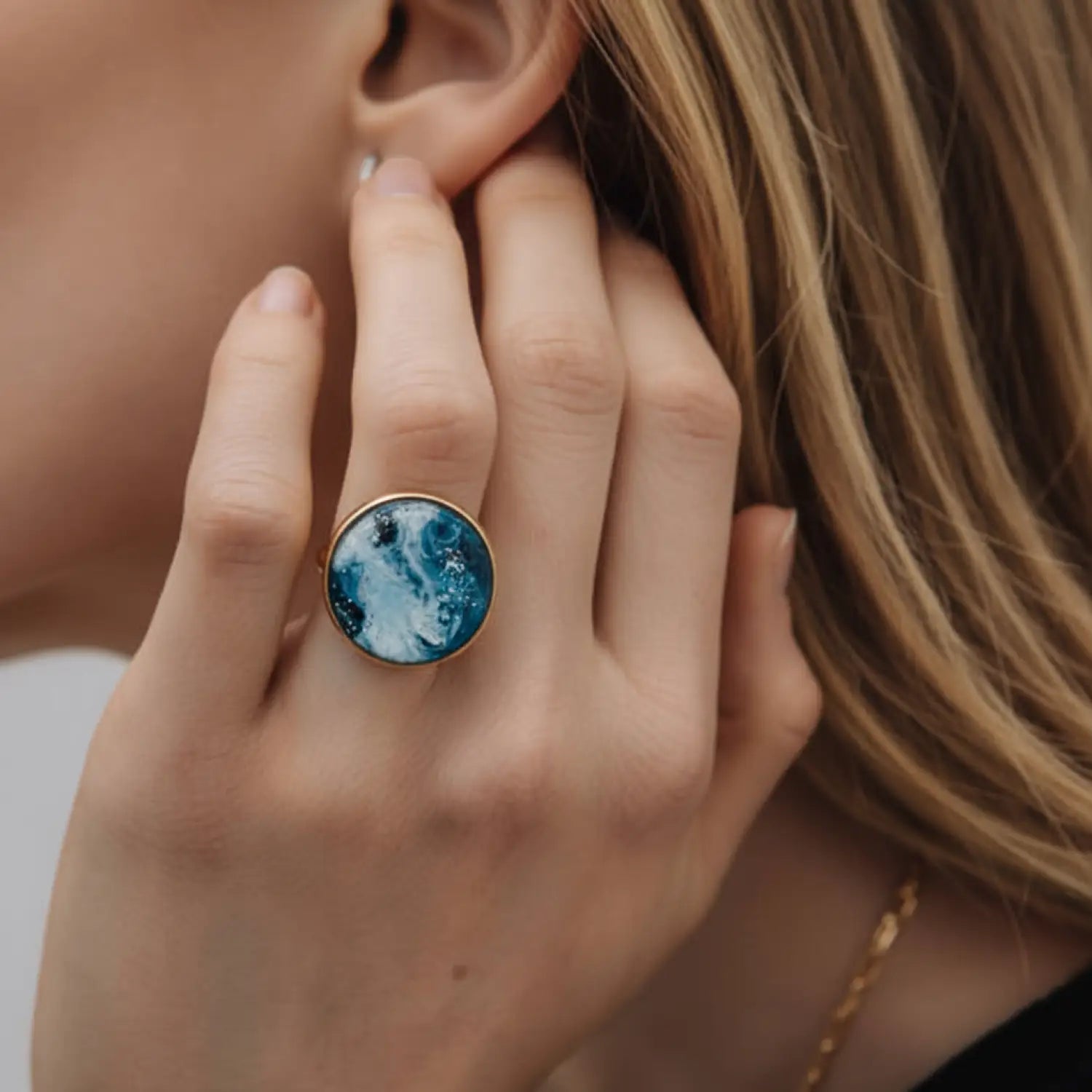 Bague réglable aux nuances de bleu, vert et blanc, complétée par des détails argentés.