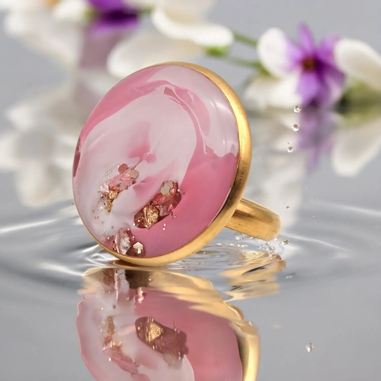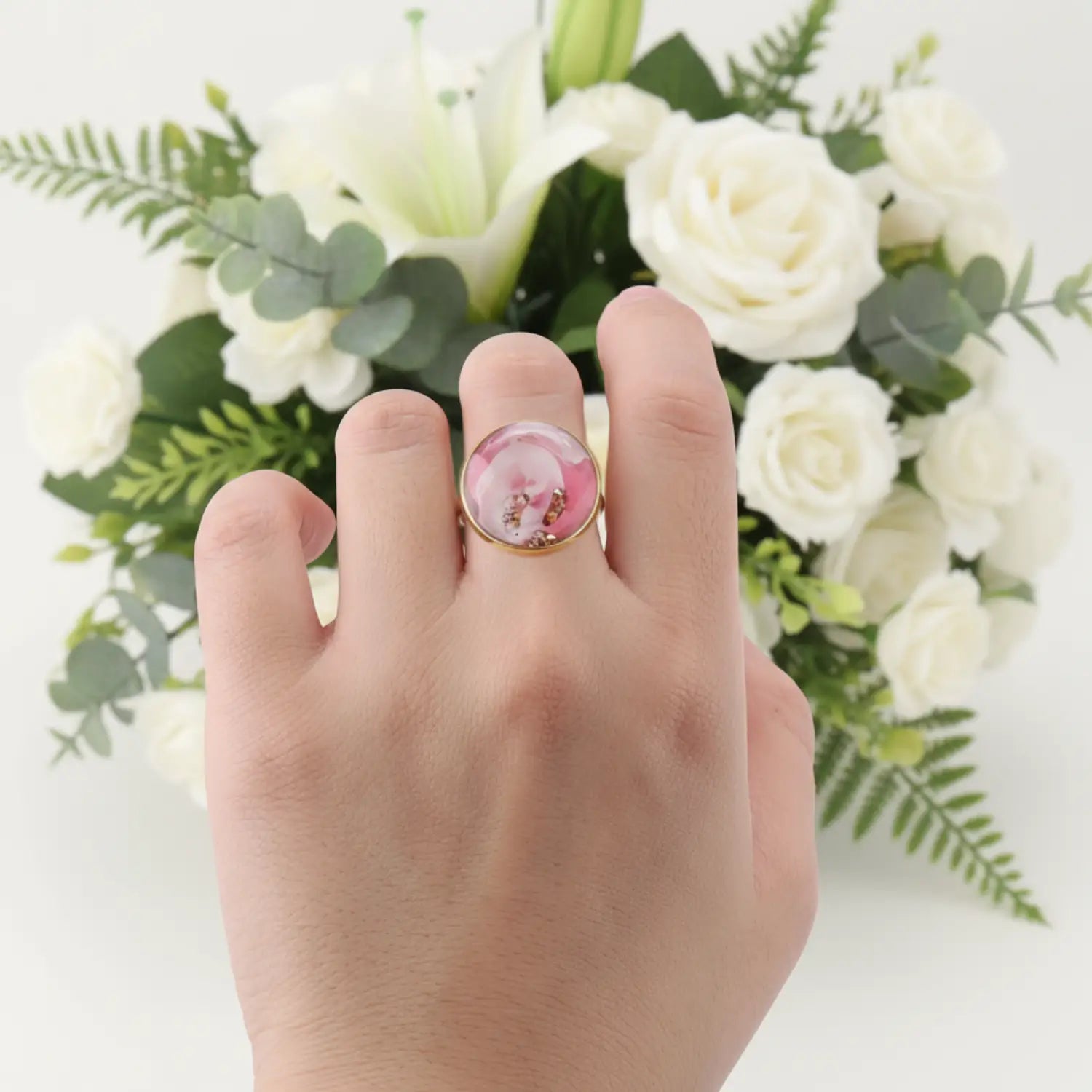 Cette bague réglable aux tons rose et blanc possède une coque époxy d'un diamètre de 20 mm. Fabriqué en acier inoxydable 304 plaqué or.
