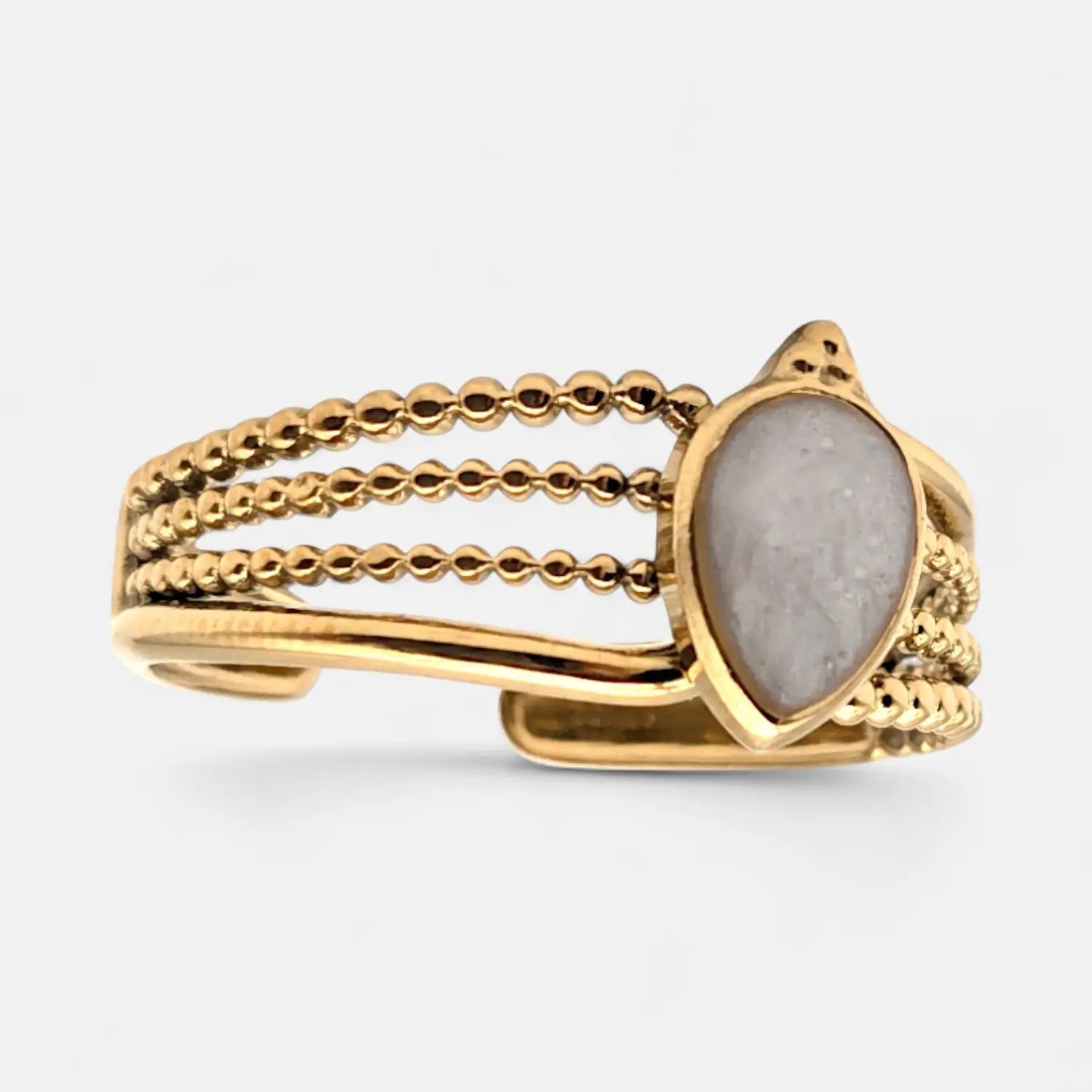 Bague réglable avec des accents en résine époxy blanche et argentée, parfaite pour n'importe quel doigt.