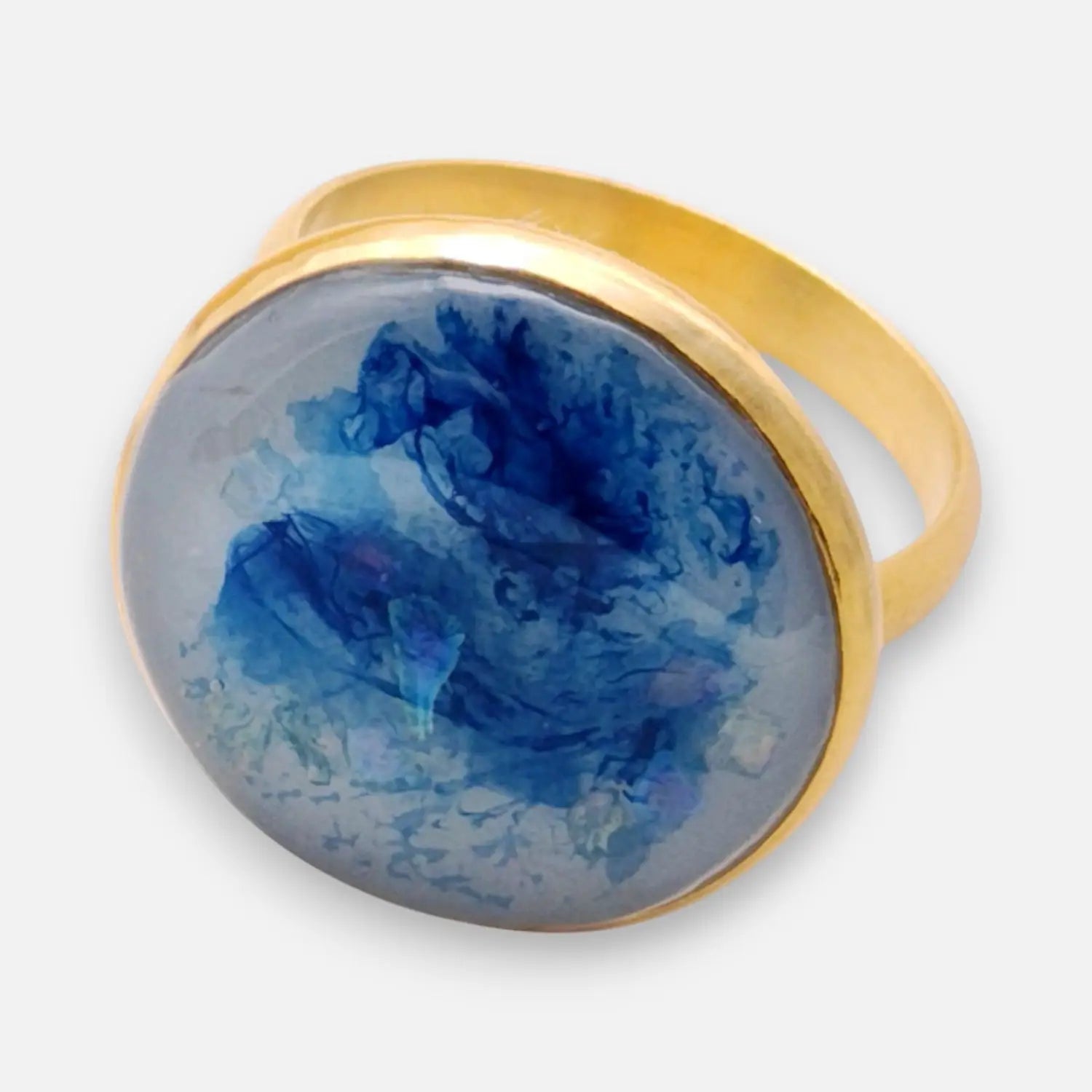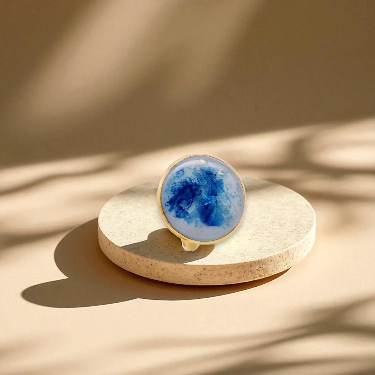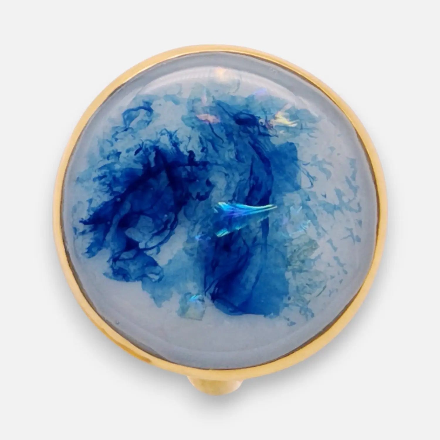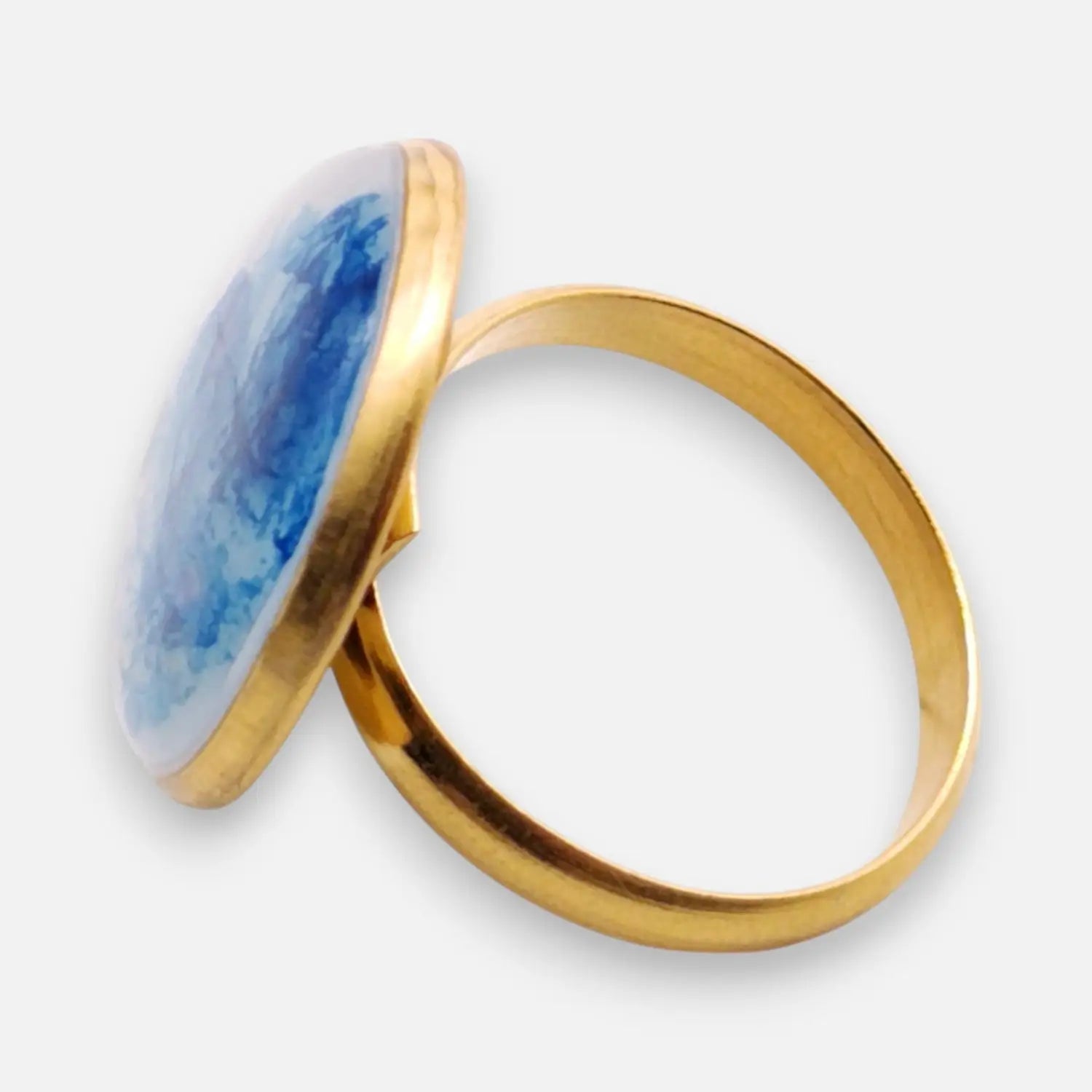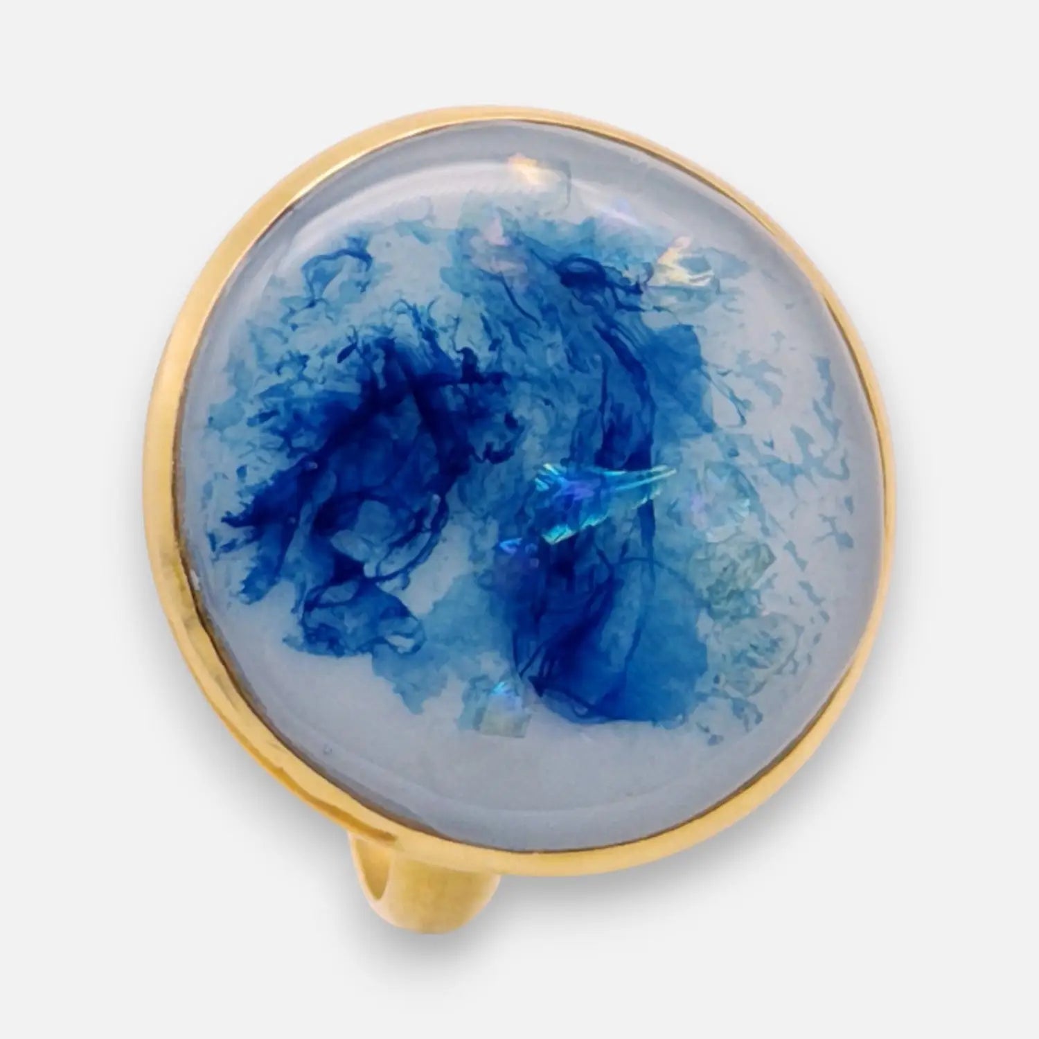 Verstellbarer, vergoldeter 304-Edelstahlring mit 18 mm Epoxidkugel in Blau/Weiß.