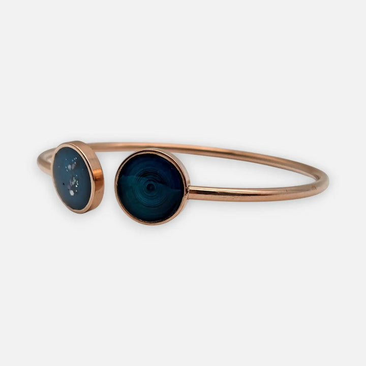 Dieser elegante Biegearmreif fängt die Tiefen des Ozeans mit seiner prächtigen blauen Farbpalette ein. Hergestellt aus 304 Edelstahl und mit einer Roségold-Vergoldung versehen, bietet der Armreif nicht nur eine exquisite Ästhetik, sondern auch eine dauerhafte Qualität. Der Durchmesser der Lünettenschale beträgt 10 mm und die Kettenstärke misst 2,5 mm, was den Armreif zu einem robusten, doch flexibel anpassbaren Schmuckstück macht.