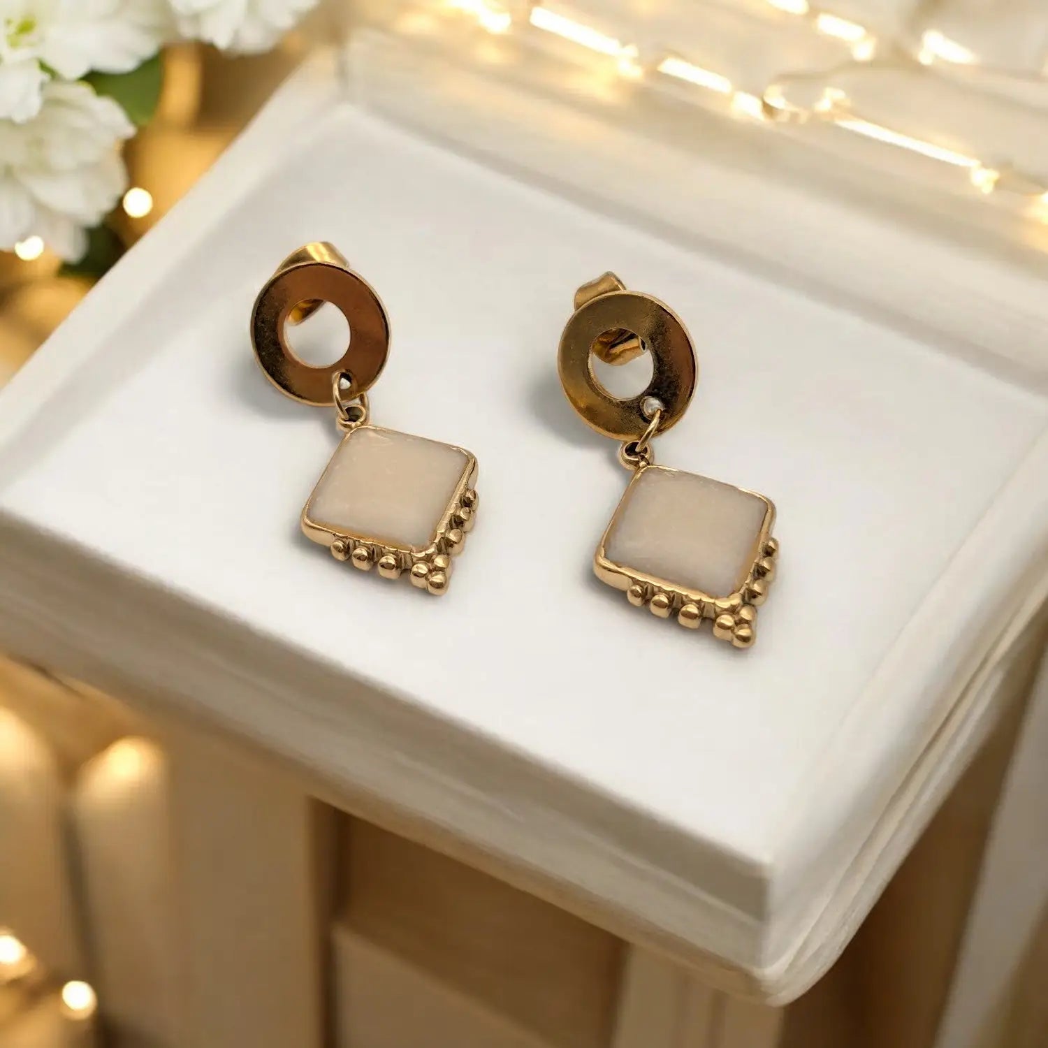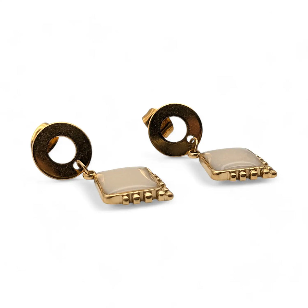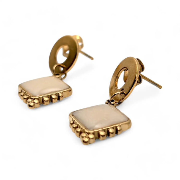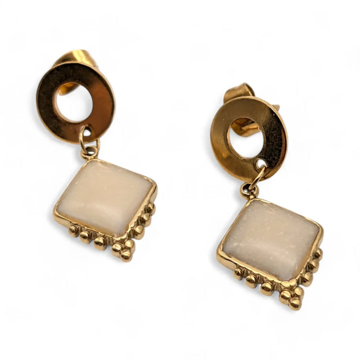 Klassische Ohrstecker mit einem Epoxidanhänger in Beigetönen, die schlichte Eleganz verkörpern.