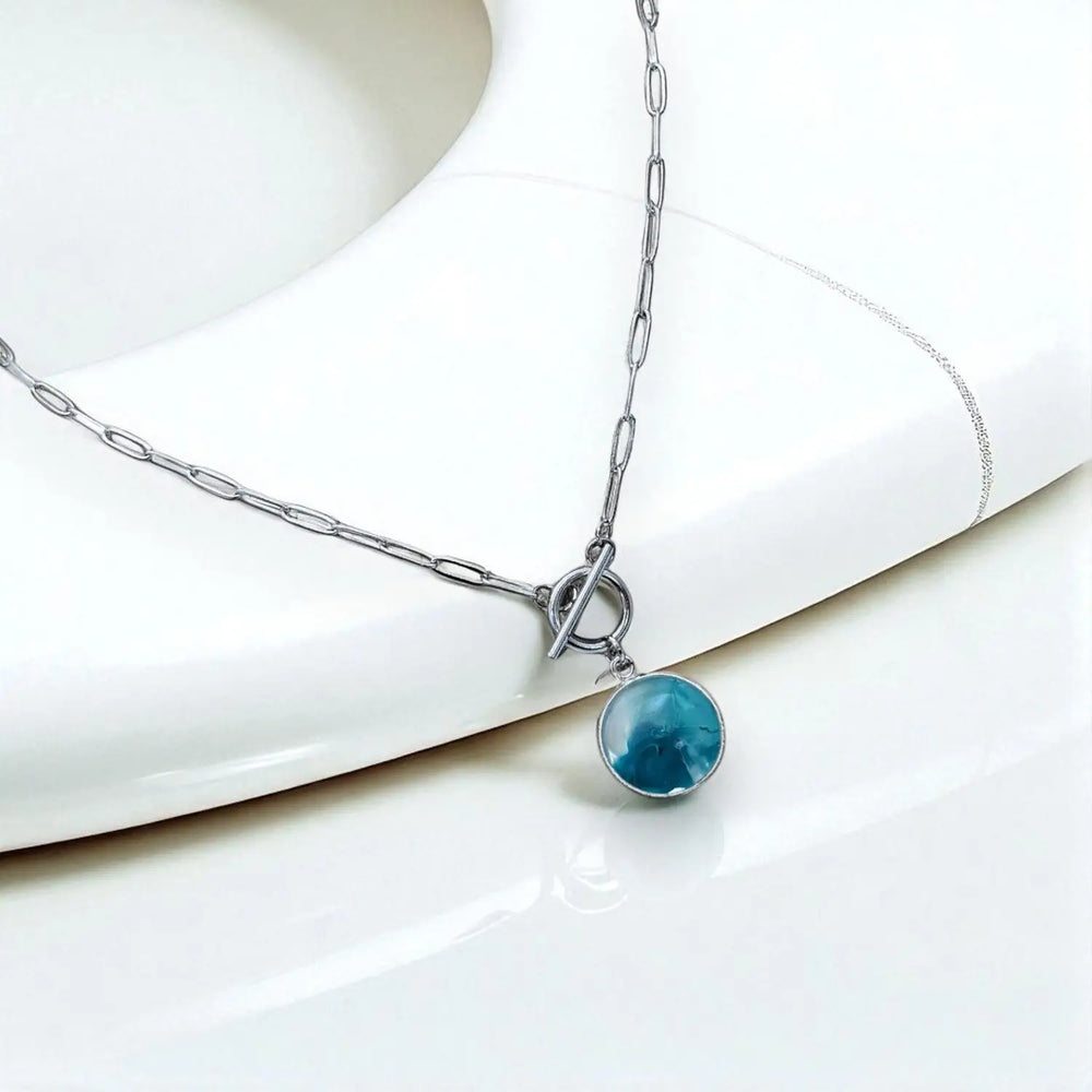 Die 46,5 cm lange "Ocean Link" Paperclip-Kette bietet mit ihren blau- und grünfarbenen Lünettenschalen und dem Hauch von Silber eine moderne Interpretation maritimer Motive. Das robuste 304 Edelstahlmaterial mit einer Lünettenschale von 18 mm und einer Kettenstärke von 3,5 mm gewährleistet Langlebigkeit, abgeschlossen mit einem stilvollen Knebelverschluss.