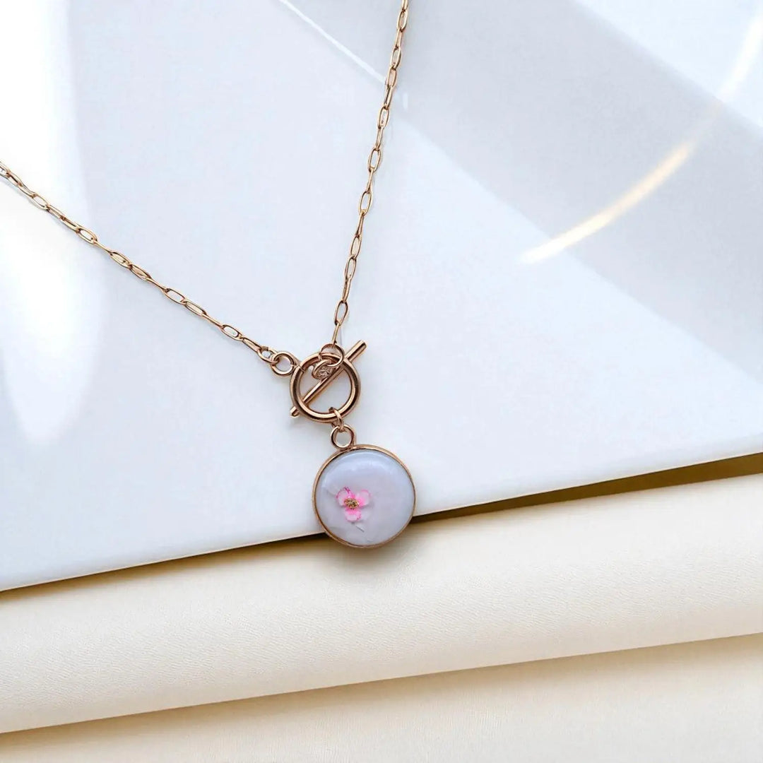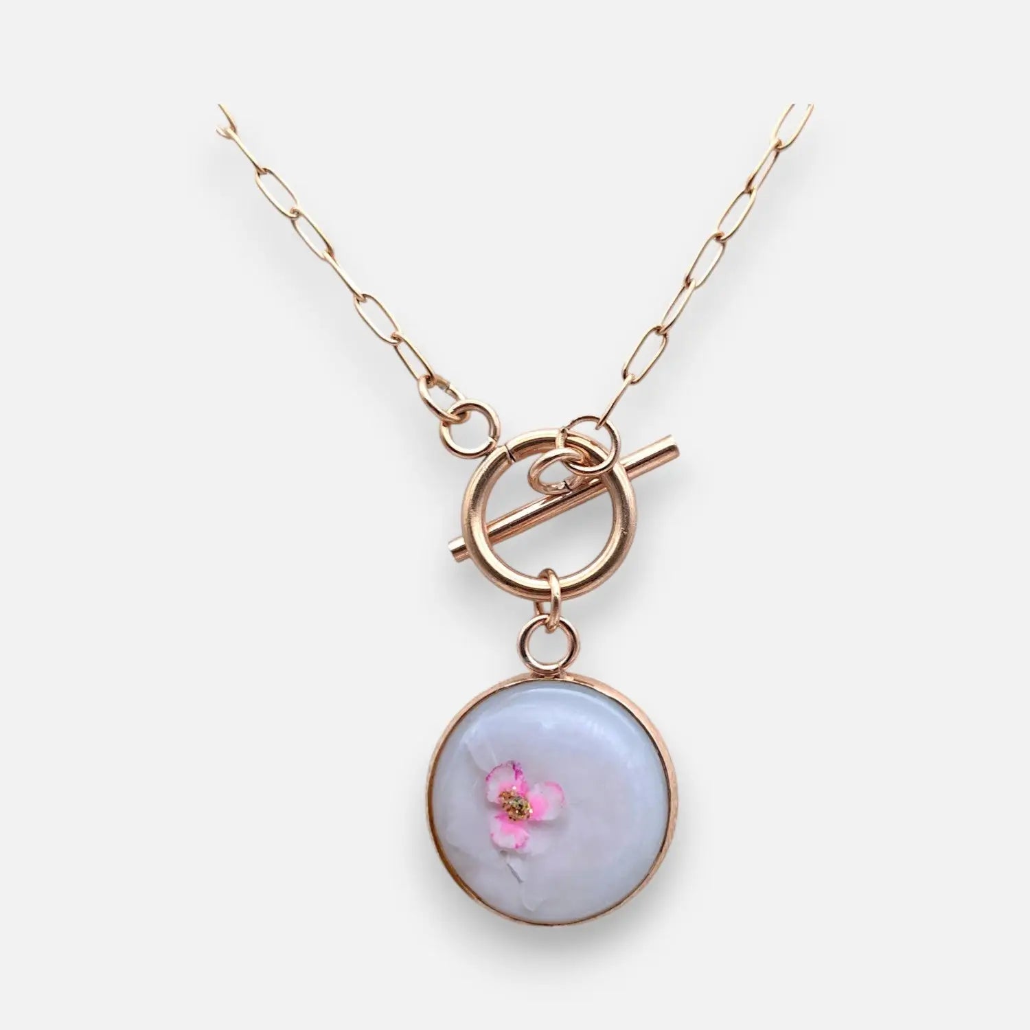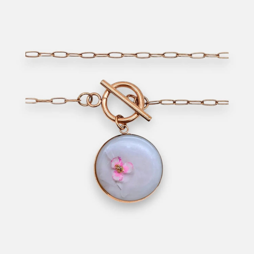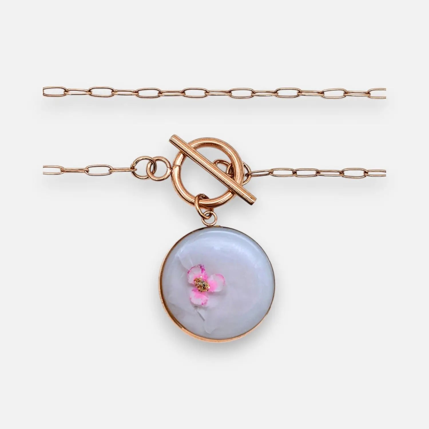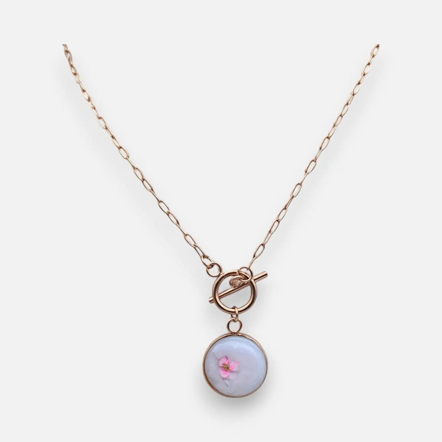 Diese Paperclip-Halskette in rosévergoldetem Edelstahl betont feminine Akzente mit einem Epoxidanhänger in Weiß-, Rosé- und Goldtönen.