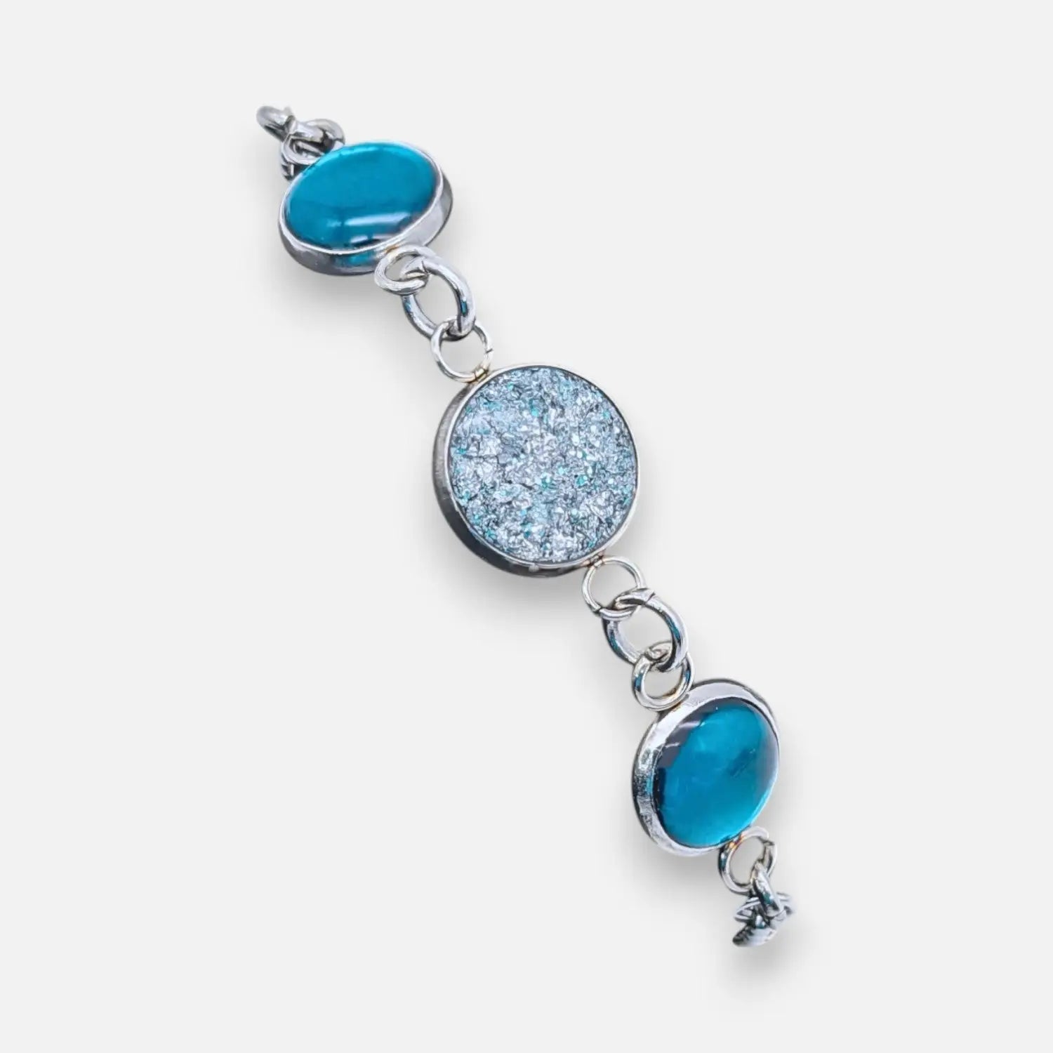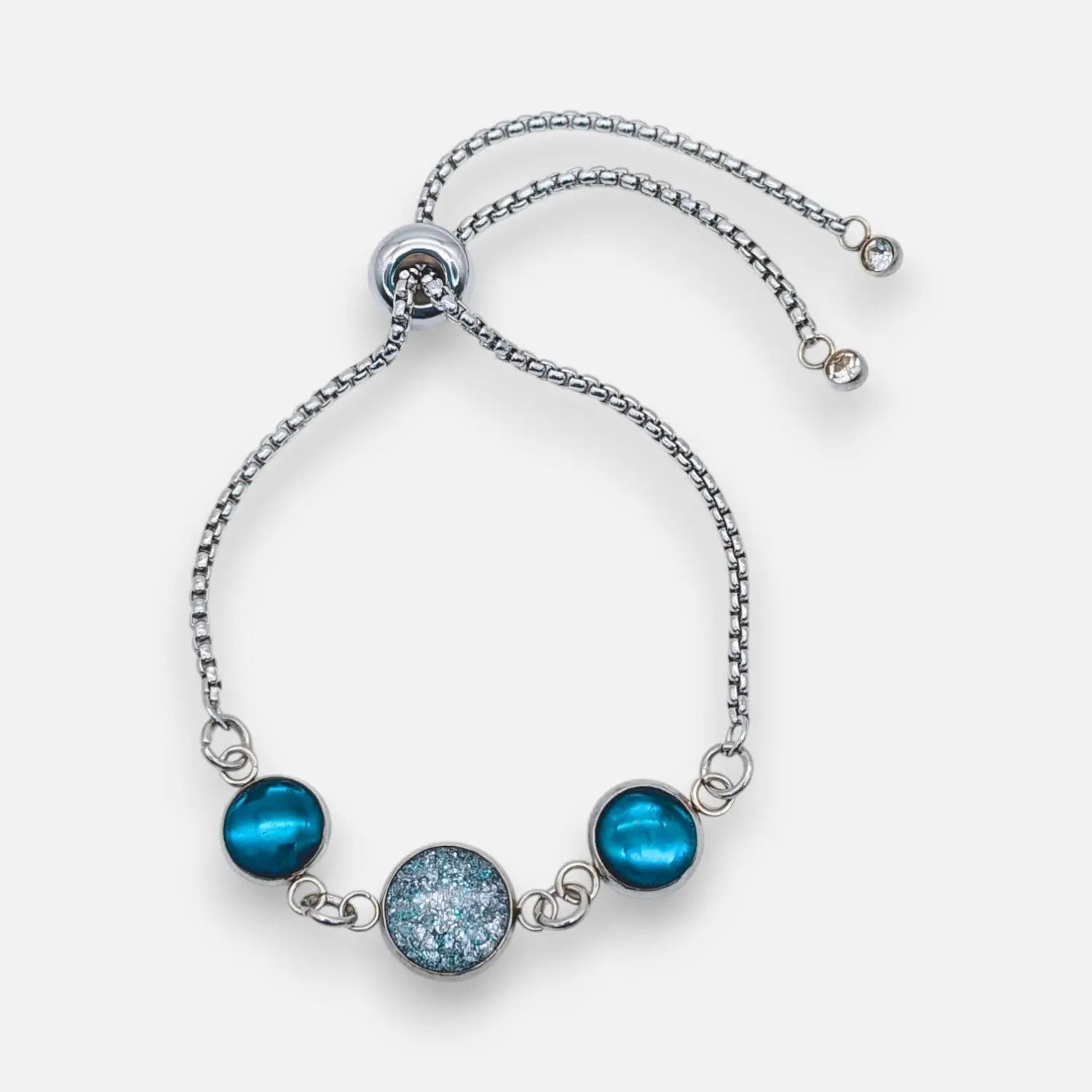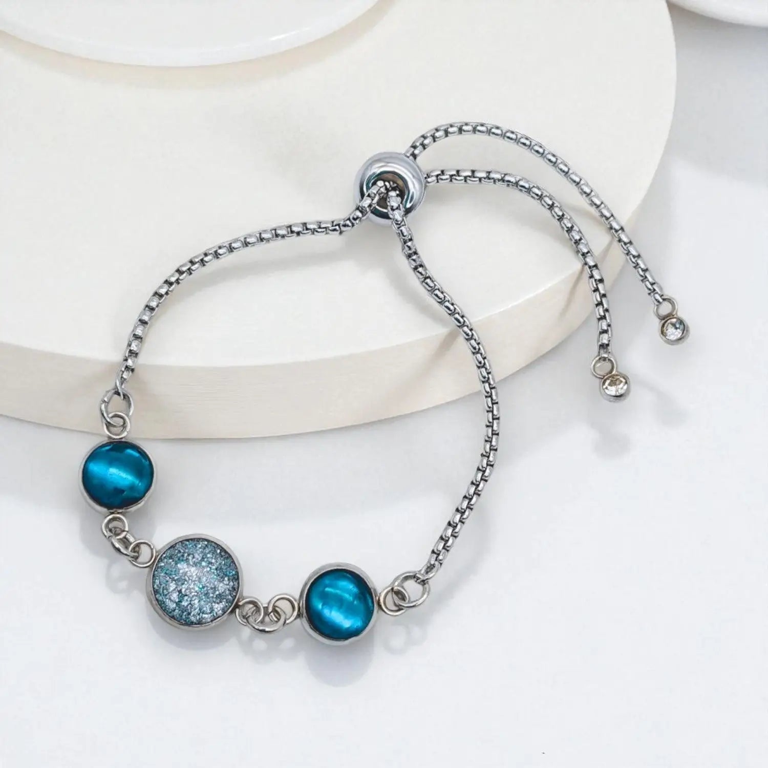 Anpassbare Eleganz trifft in dieser 23 cm langen venezianischen Kette mit Blautönen und Silberakzenten aufeinander, abgerundet durch einen Strasskristall auf nativem 304 Edelstahl.
