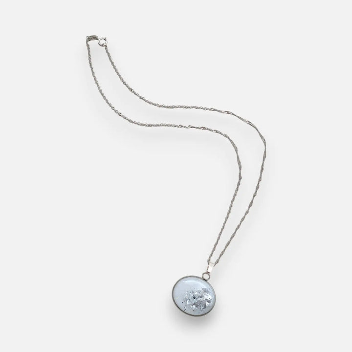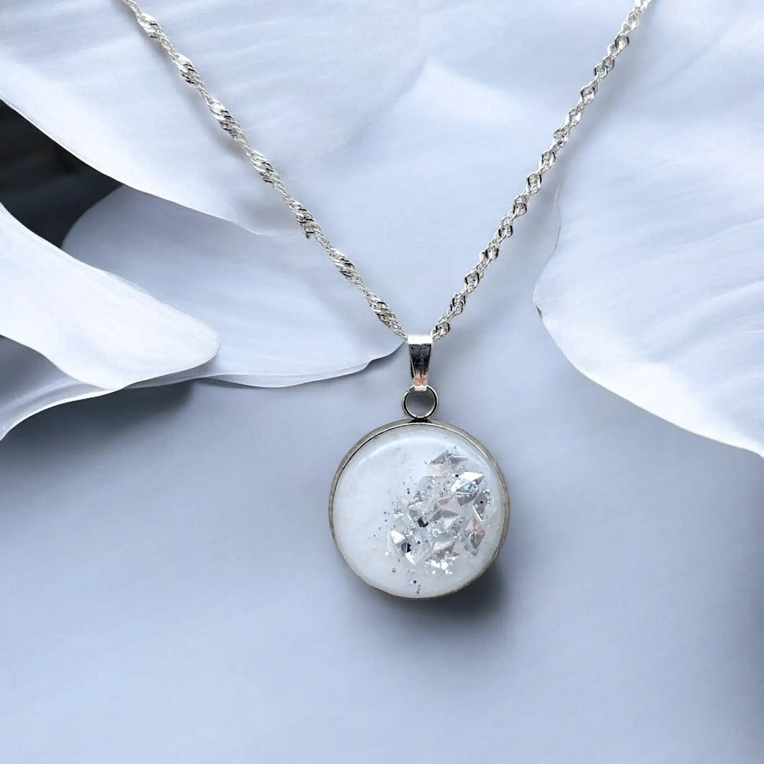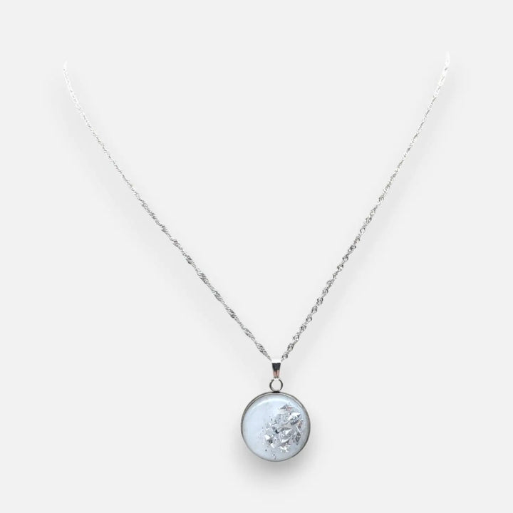 Eine zarte Prince of Wales-Kette aus 925er Sterling Silber, perfekt ergänzt durch den schlichten Epoxidanhänger in Weiß- und Silbertönen.