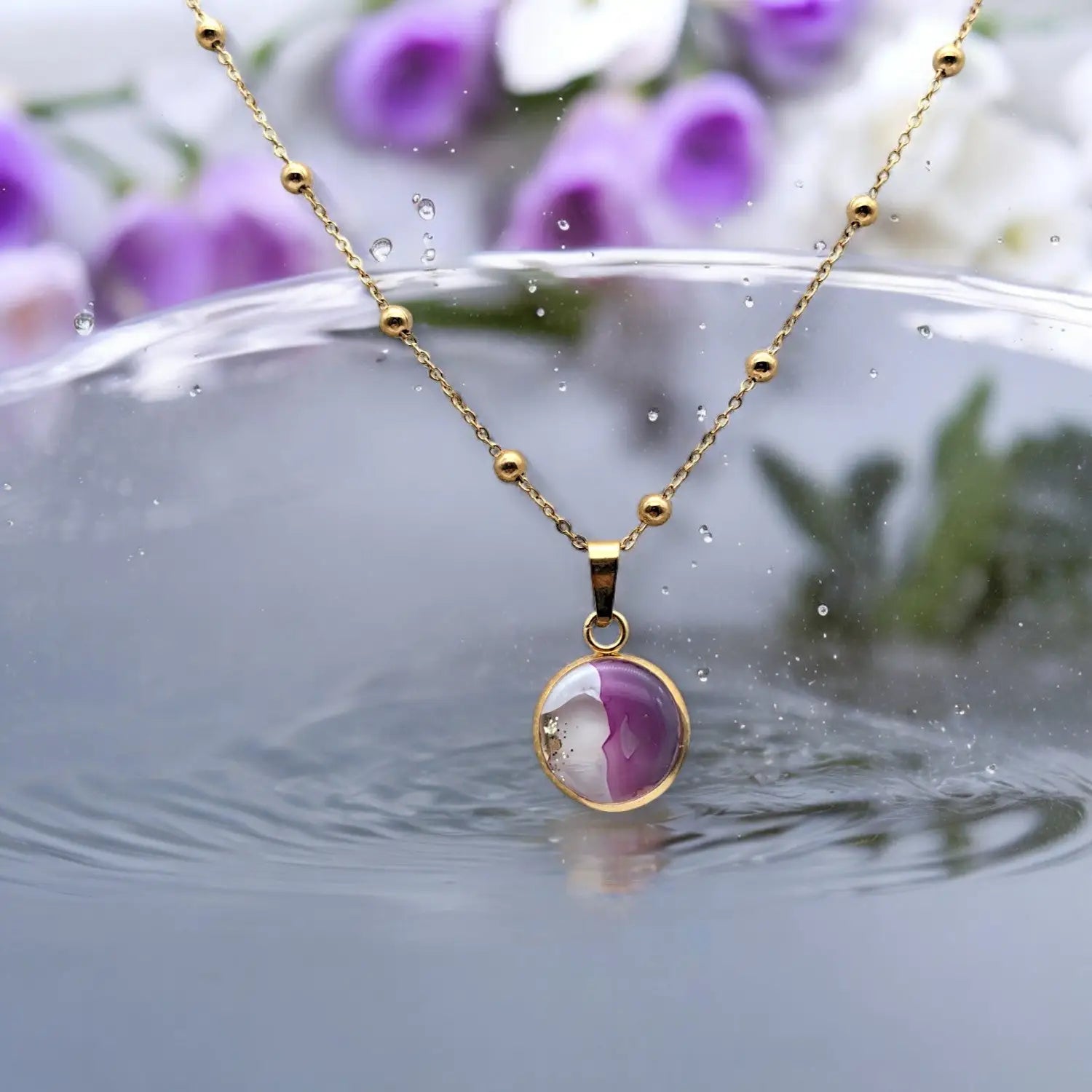 Diese Kugelankerkette mit einer 5 cm Verlängerung und violetten und weißen Tönen hat eine Epoxidschale mit einem Durchmesser von 12 mm und eine Kettenstärke von 1.5 mm. Hergestellt aus vergoldetem 304 Edelstahl. Länge der Halskette: 50 cm. Verschlussart: Karabinerschließe.