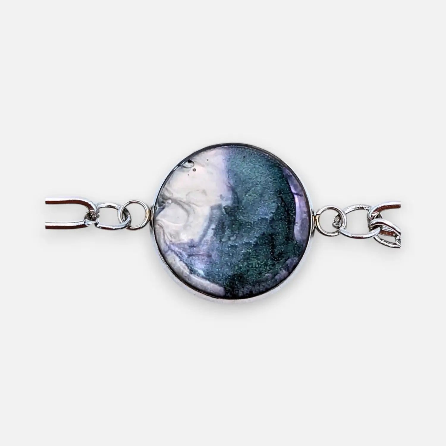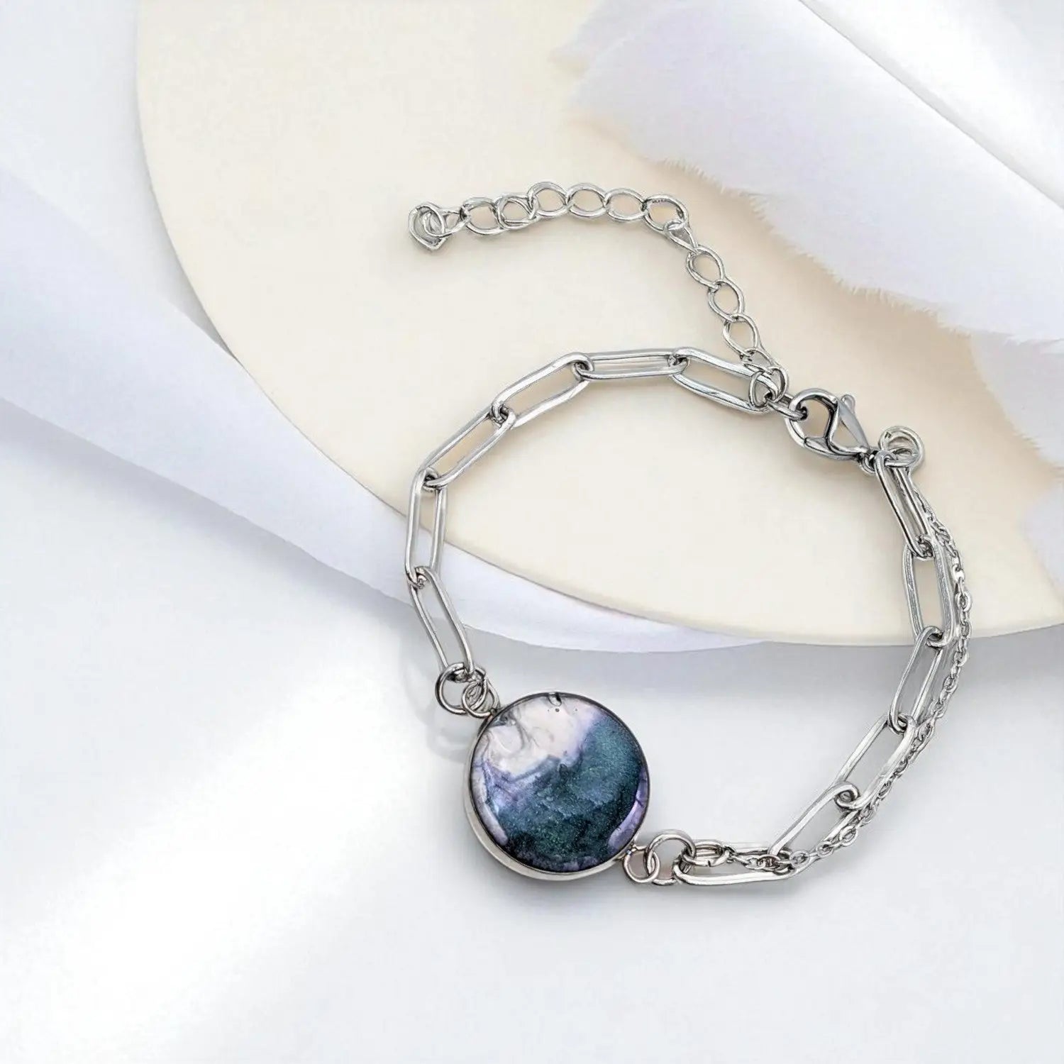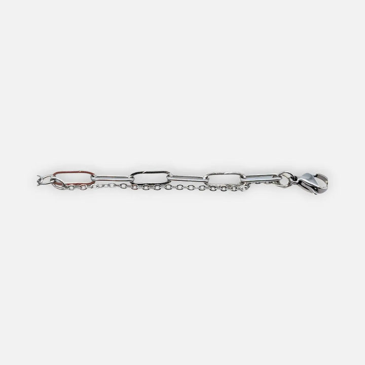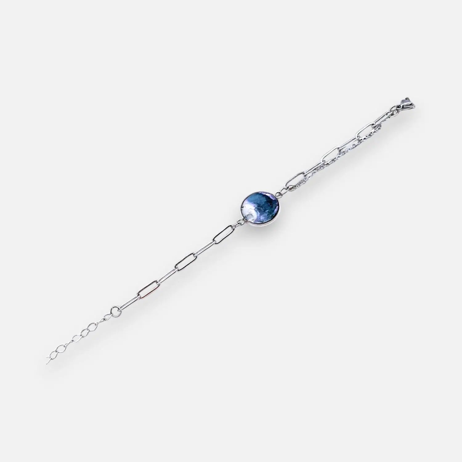 Die 14,5 cm lange Paperclip-Kette wird durch eine 60mm Verlängerung ergänzt und spielt mit dem Kontrast von Weißtönen, Perlmutt und Violettnuancen, um eine faszinierende Wirkung zu erzielen.